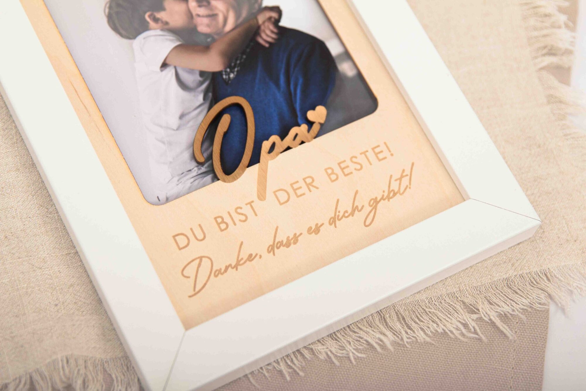 Dieses Opa-Bild ist aus 3 mm Birken-Holz gestanzt und mit einer Botschaft graviert. Es ist als Deckseite in einen Bilderrahmen gelegt in den ihr dann noch ein ganz persönliches Bild legen könnt.
