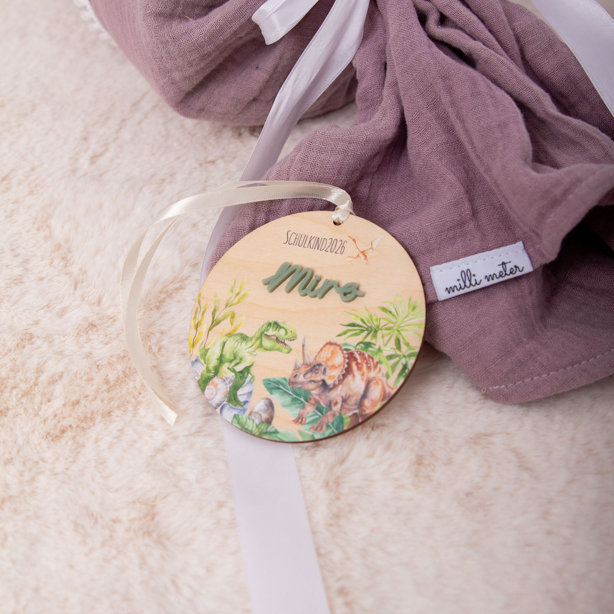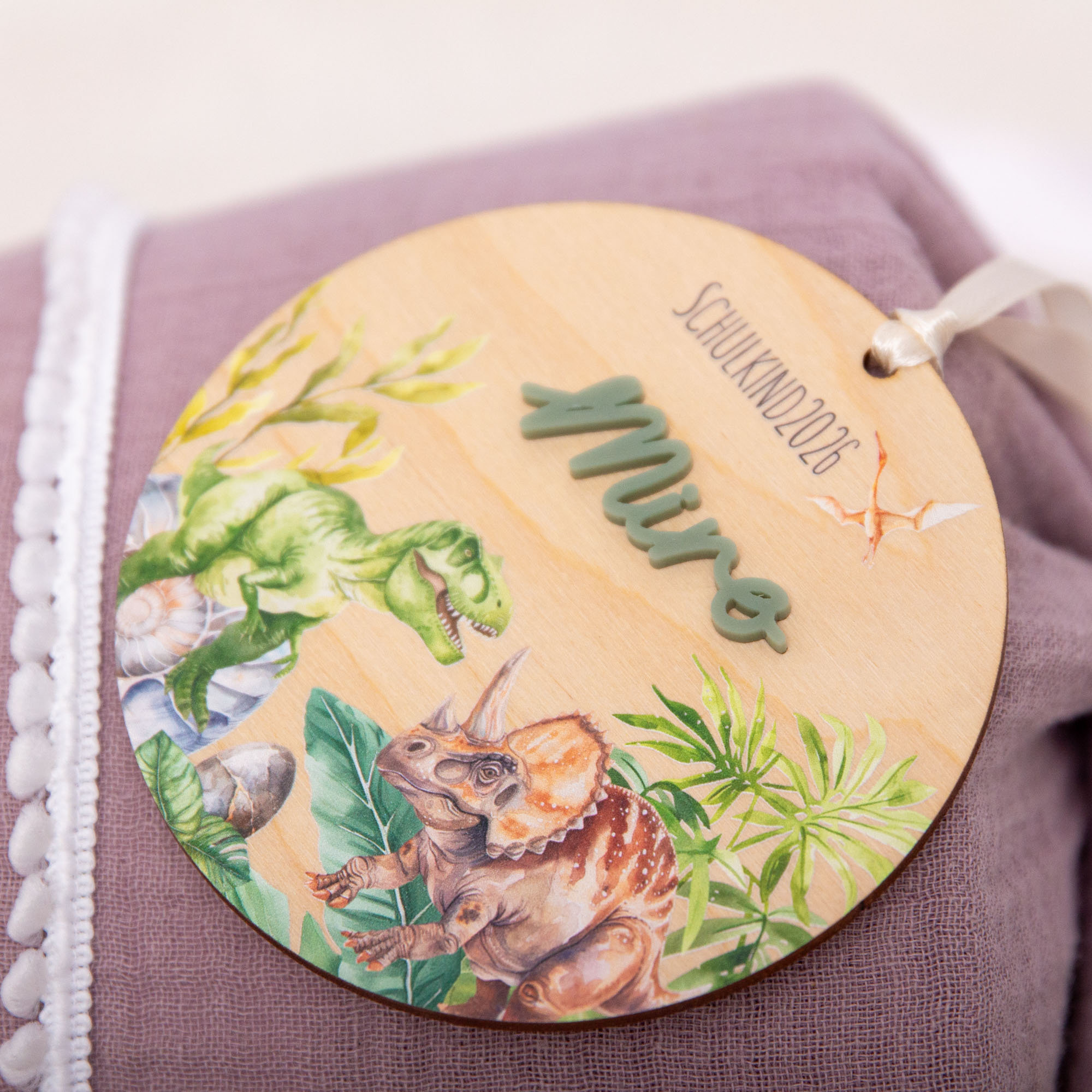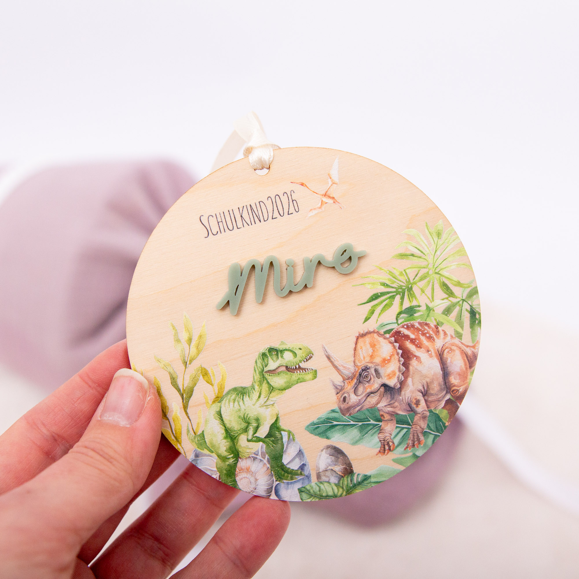 Dinosaurier Zuckertütenanhänger mit Name / Namensanhänger Einschulung 2026 / Zuckertütenanhänger Dino aus Holz mit Name / Geschenkanhänger