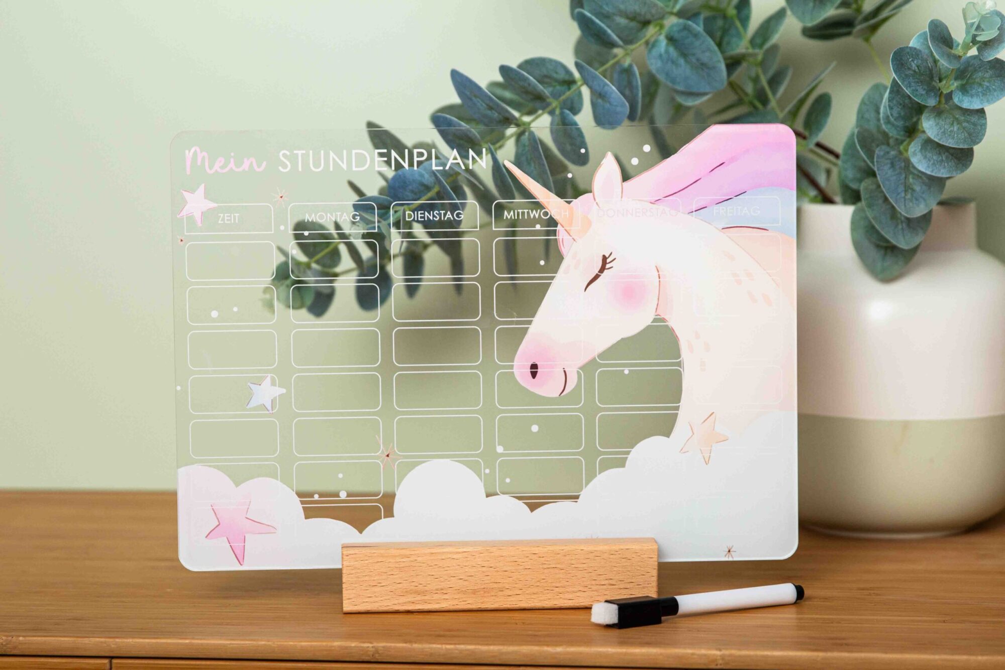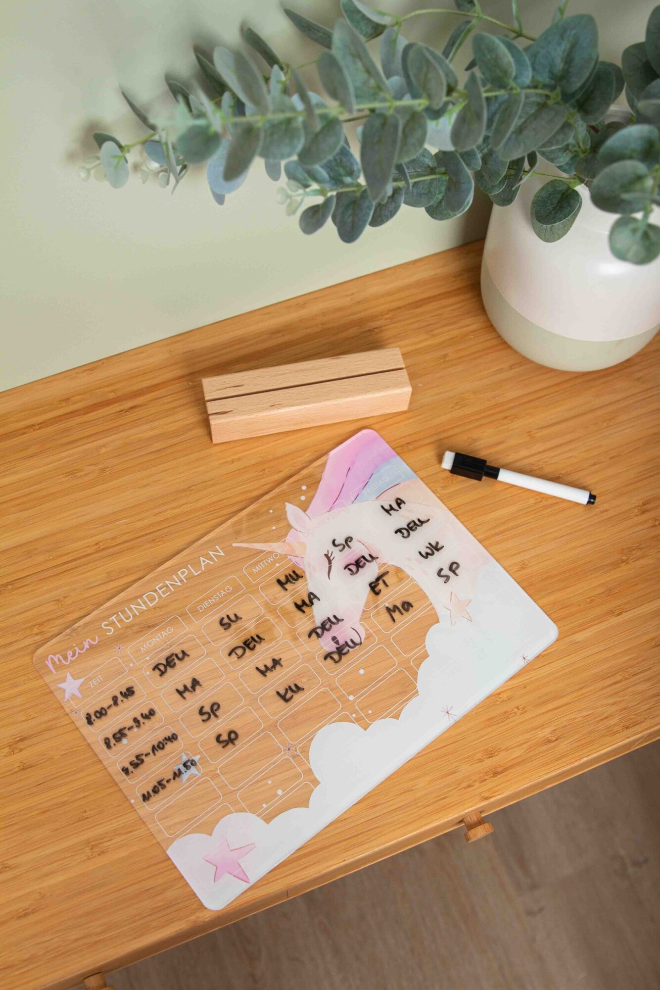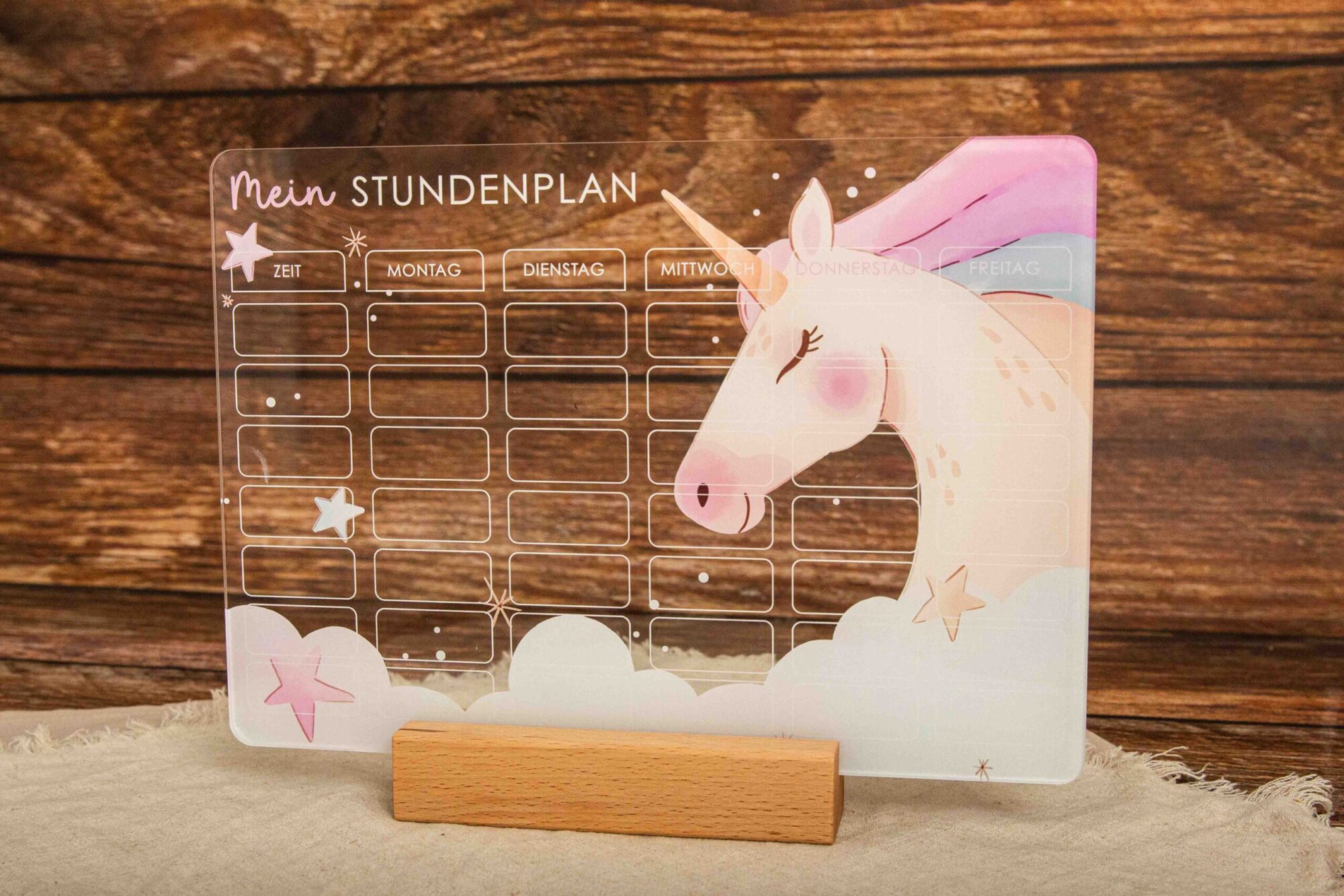 Einhorn Stundenplan aus Acryl, Planer mit Echtholzsockel / individuell beschreiben und wegwischen / Stundenplan zur Einschulung
