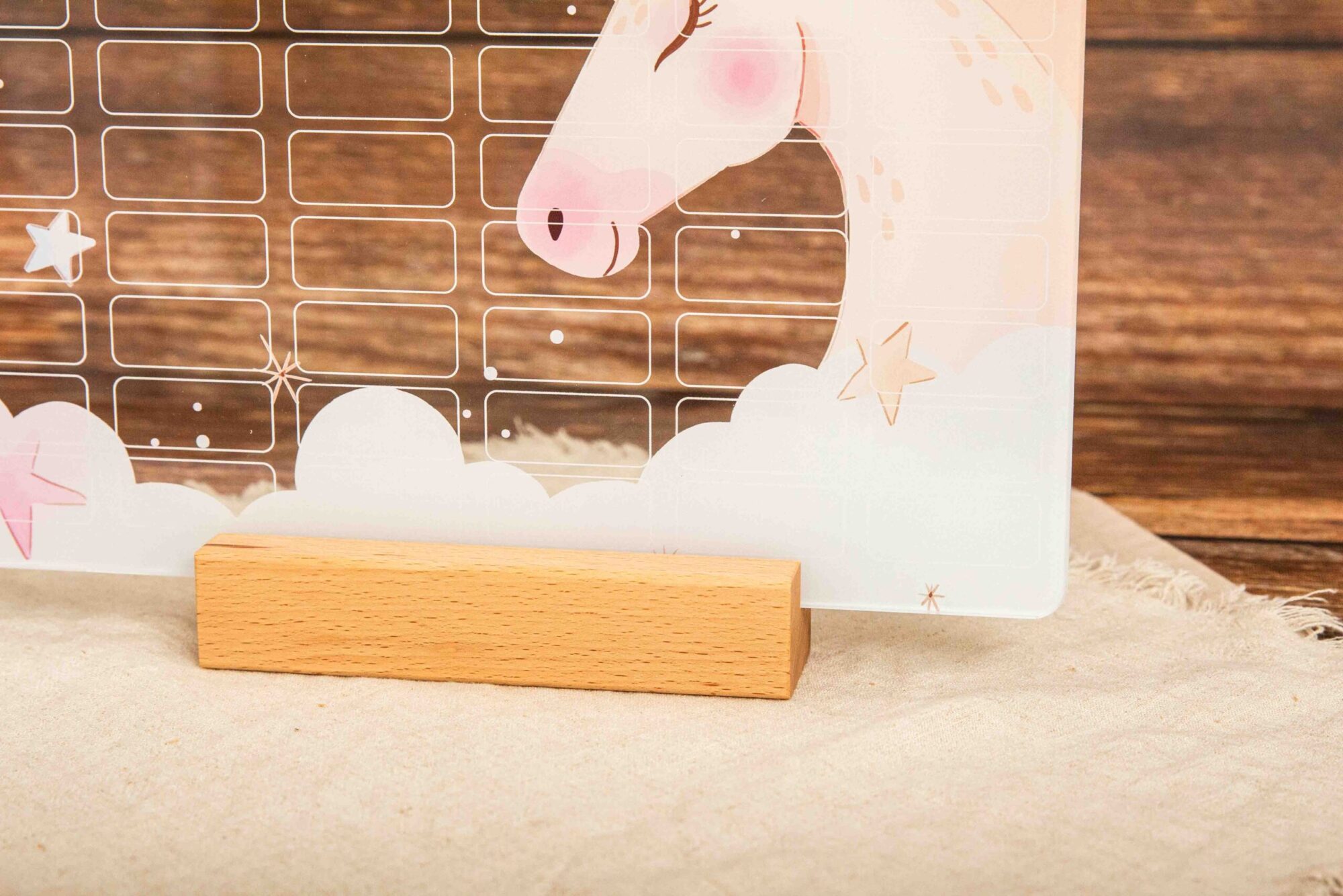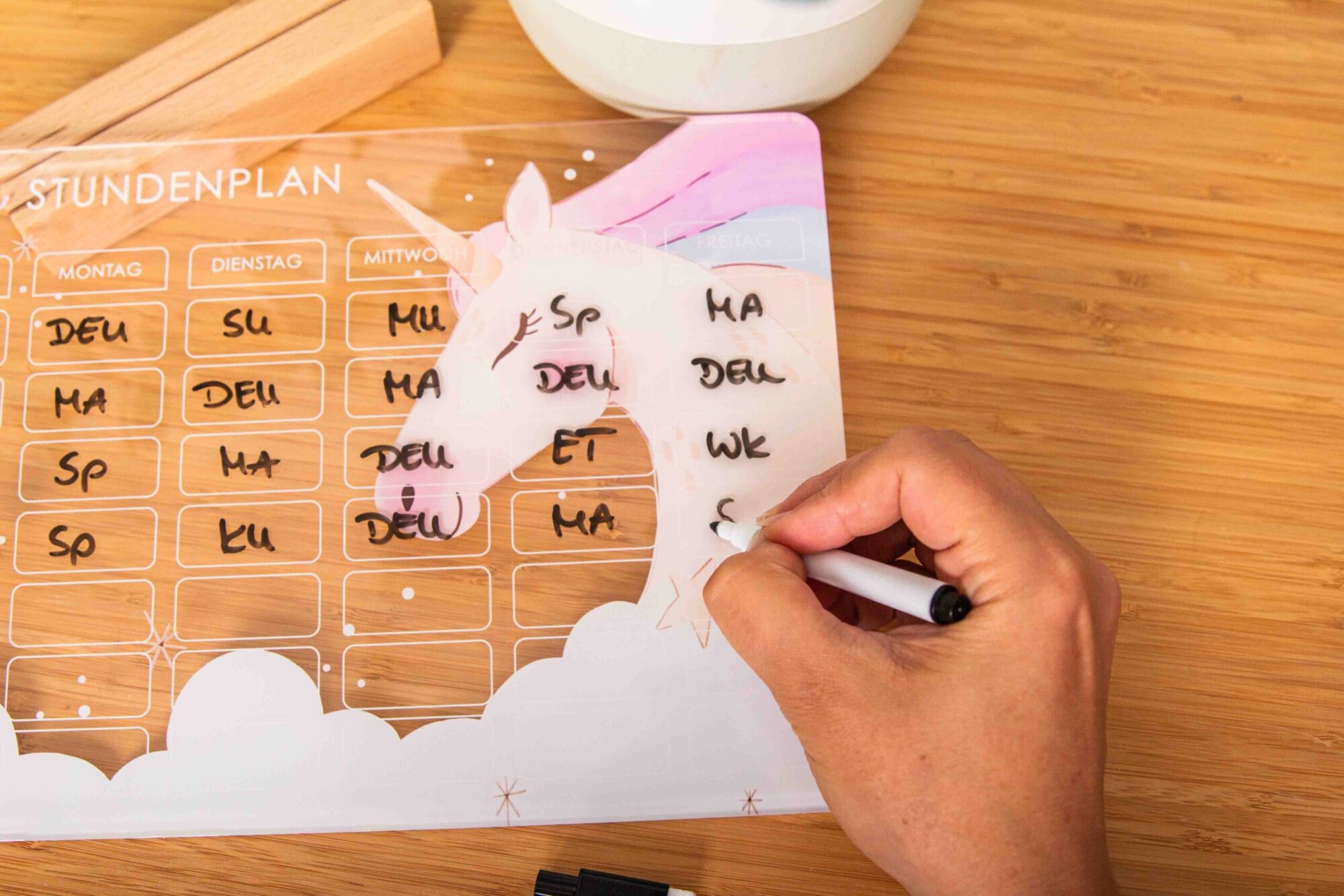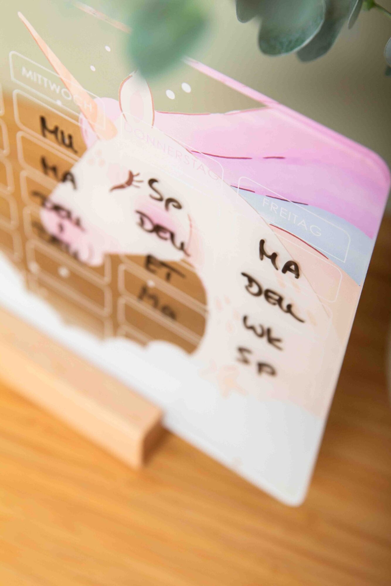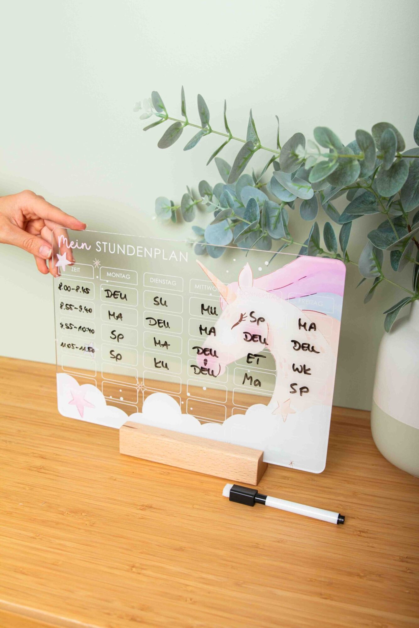Einhorn Stundenplan aus Acryl, Planer mit Echtholzsockel / individuell beschreiben und wegwischen / Stundenplan zur Einschulung