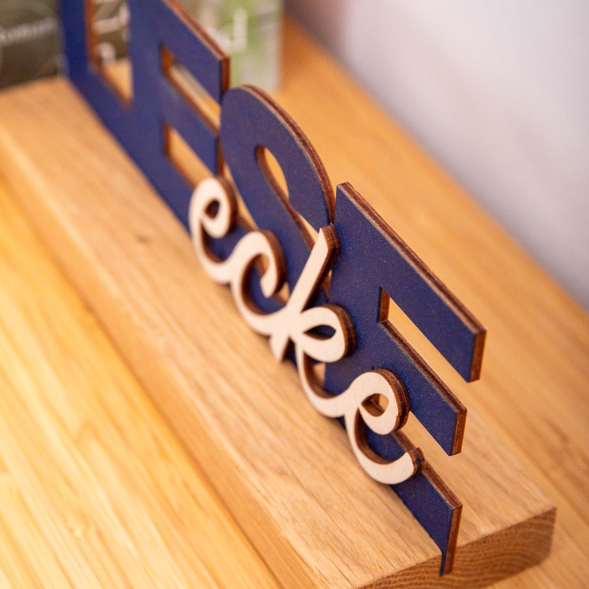 Der filigrane Schriftzug wird aus hochwertigem Birkenholz gefertigt und sorgfältig lackiert. Den stabilen Gegenpol bildet der Standfuß aus echtem Massivholz, der für die nötige Standfestigkeit sorgt.