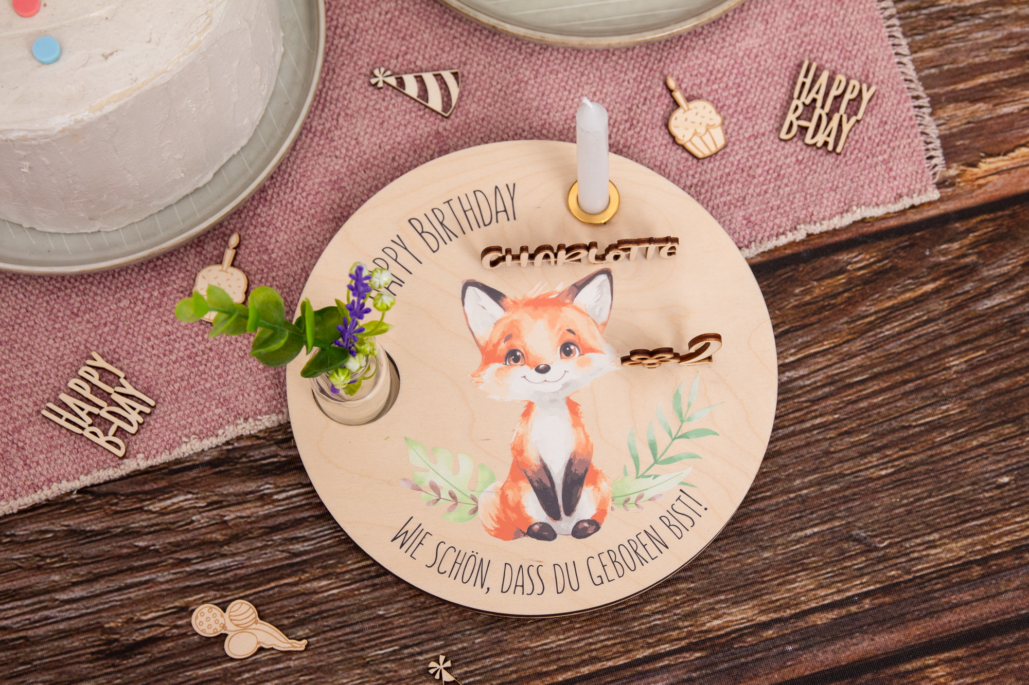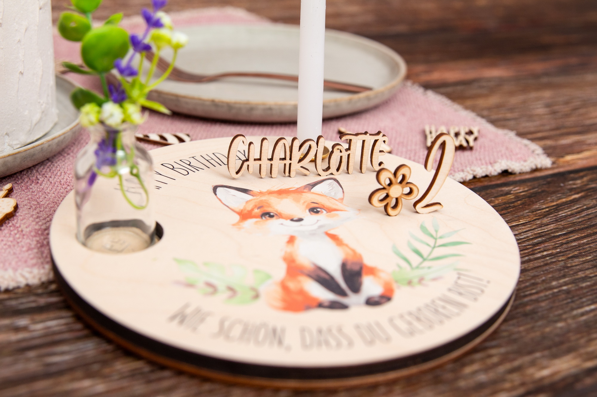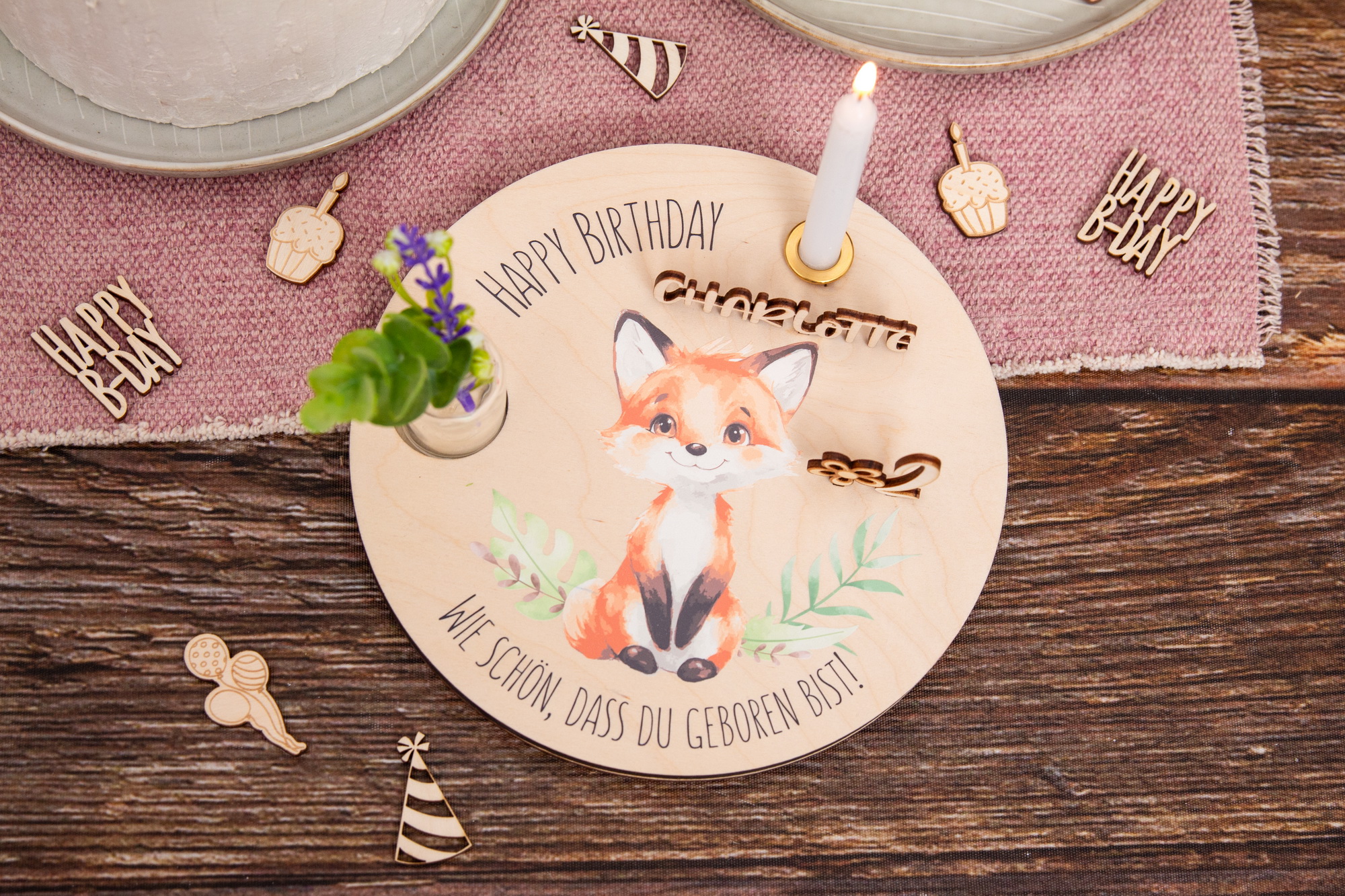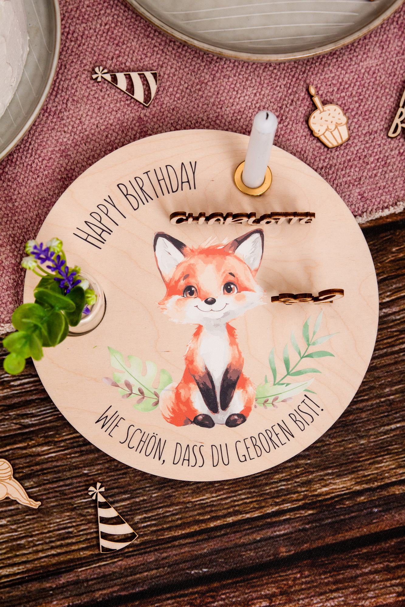 Geburtstagsteller Fuchs und Zahlenset – Geschenkidee zum Geburtstag / Nachhaltig und jährlich einsetzbar inkl. Zahlenset mit 0-9 (1 doppelt)