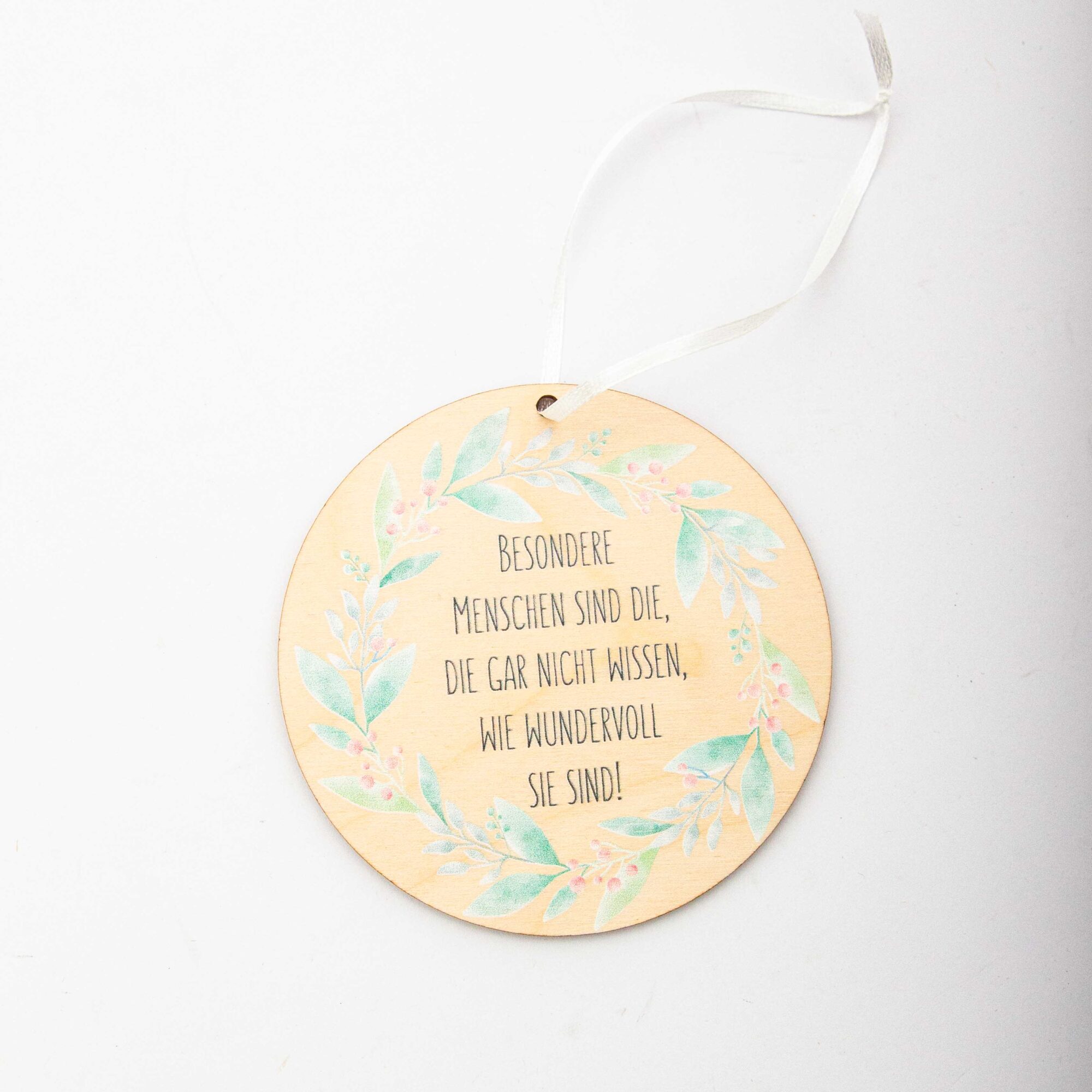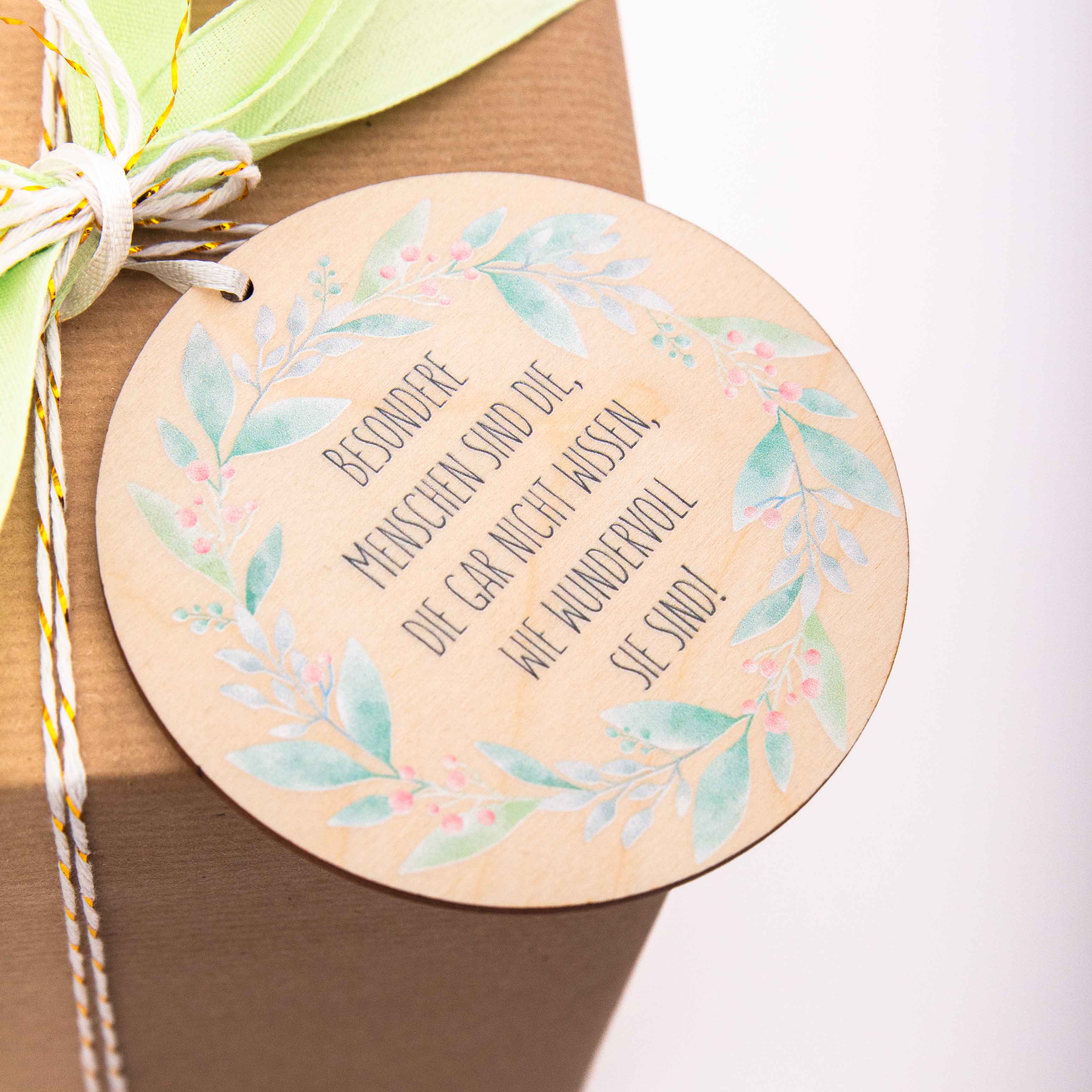 Echte Schönheit kommt von innen! Unser runder Holzanhänger mit dem filigranen Blumenkranz-Motiv und dem tiefgründigen Spruch „Besondere Menschen sind die, die gar nicht wissen, wie wundervoll sie sind“ ist eine liebevolle Botschaft an alle Lieblingsmenschen. Er ist das perfekte Geschenk, um jemandem zu sagen: „Ich sehe dich und du bist einzigartig.“