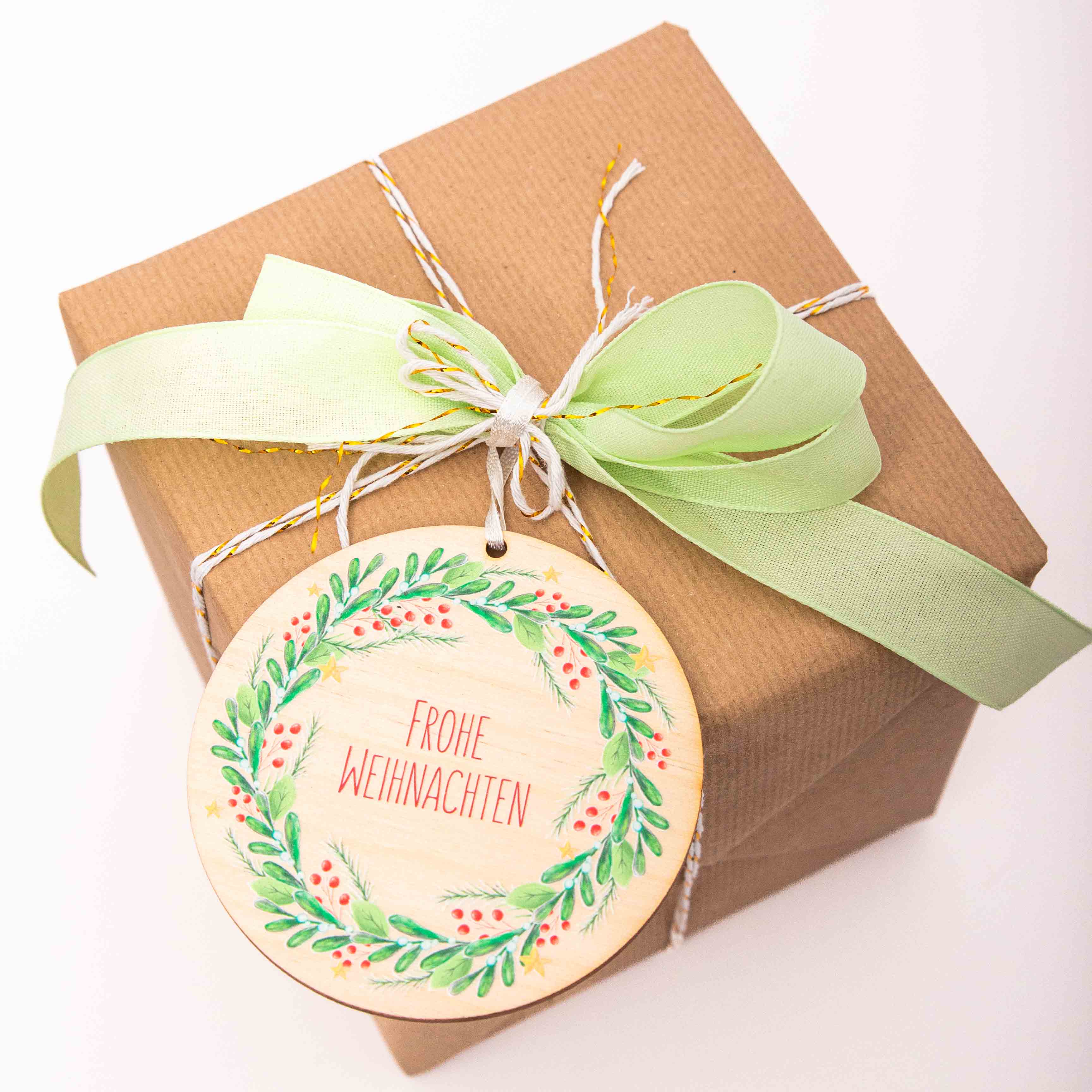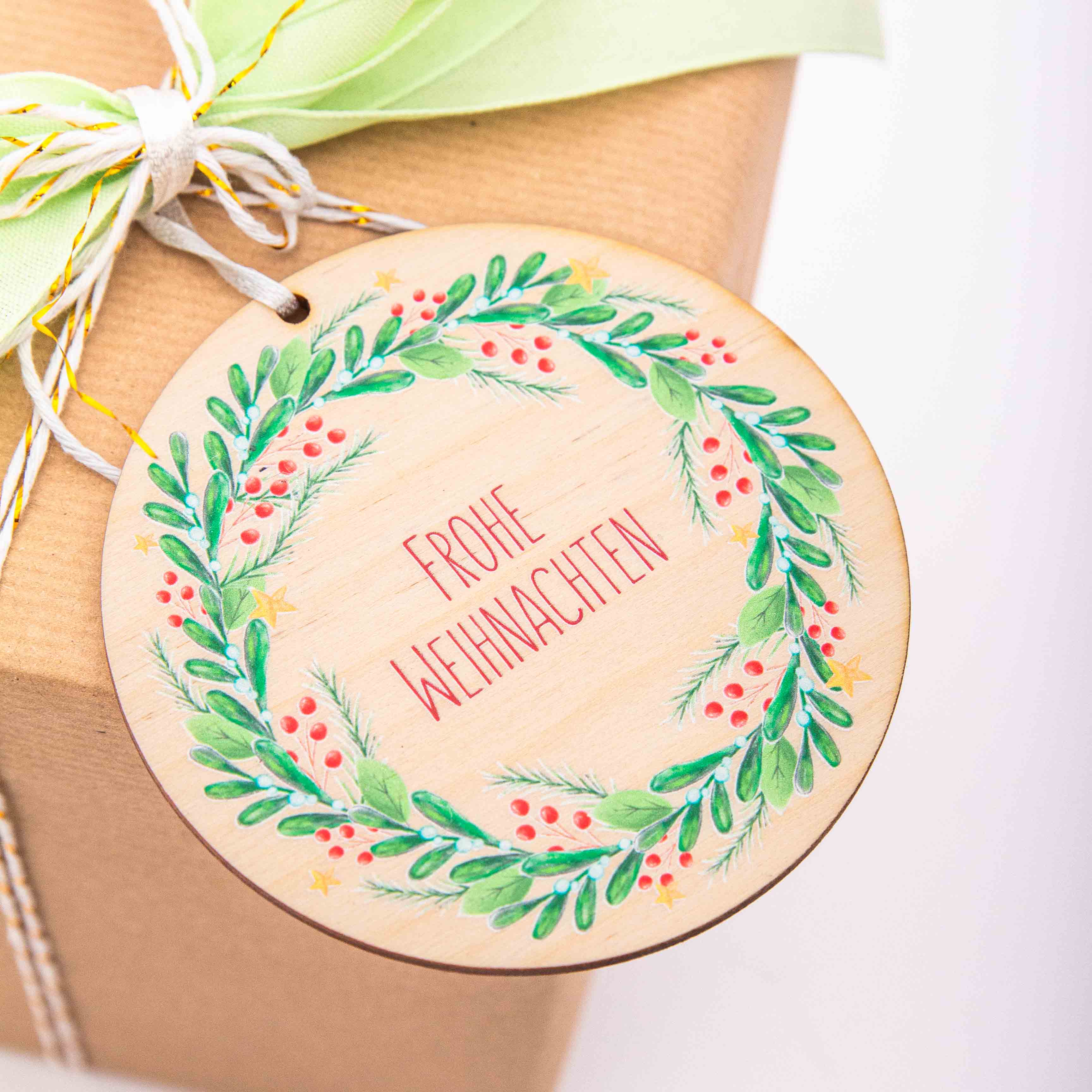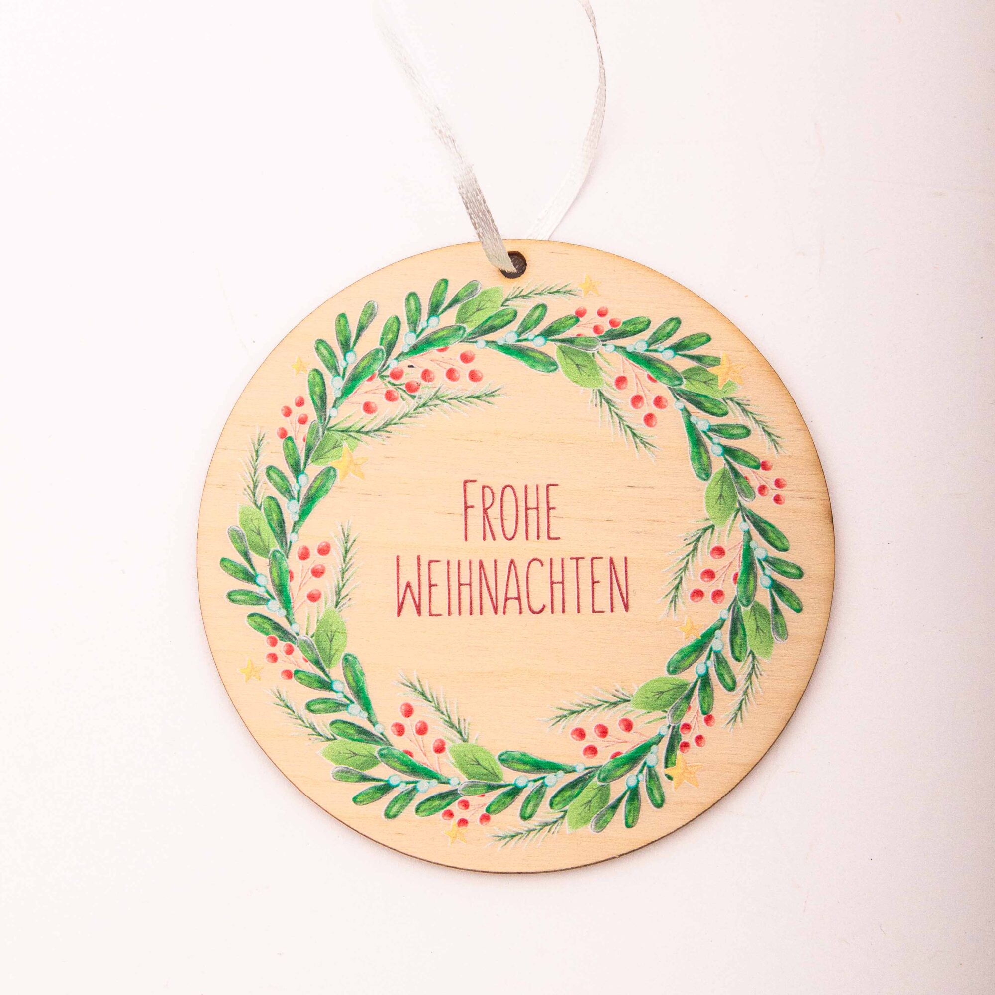 Weihnachtsanhänger Holz „Frohe Weihnachten“ – Edler Geschenkanhänger mit Blumenkranz – Nachhaltige Weihnachtsdeko & Glücksbringer – Made in Leipzig