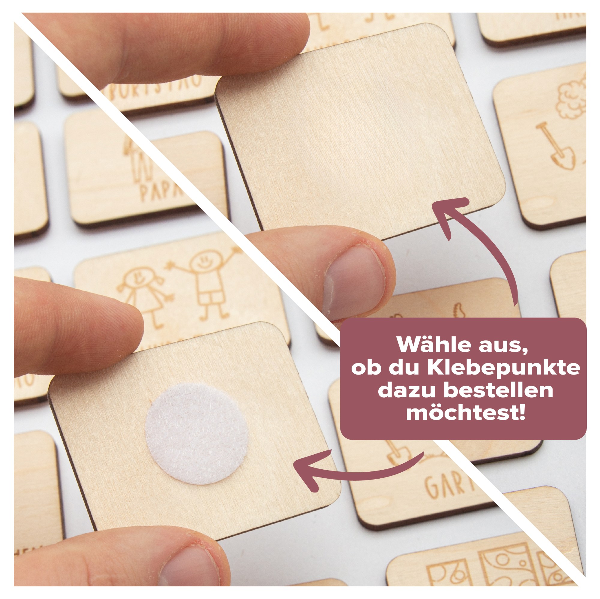 Unsere Holz-Aktivitätskarten sind als Ergänzung und Erweiterung für alle gängigen Wochenplaner und Tagesroutinen-Helfer aus unserem Shop gedacht. Die Karten sind einzeln bestellbar und universell einsetzbar. Wir bieten optional Klett-Klebepunkte an, damit du die Karten sofort an deinem vorhandenen Planer befestigen kannst.
