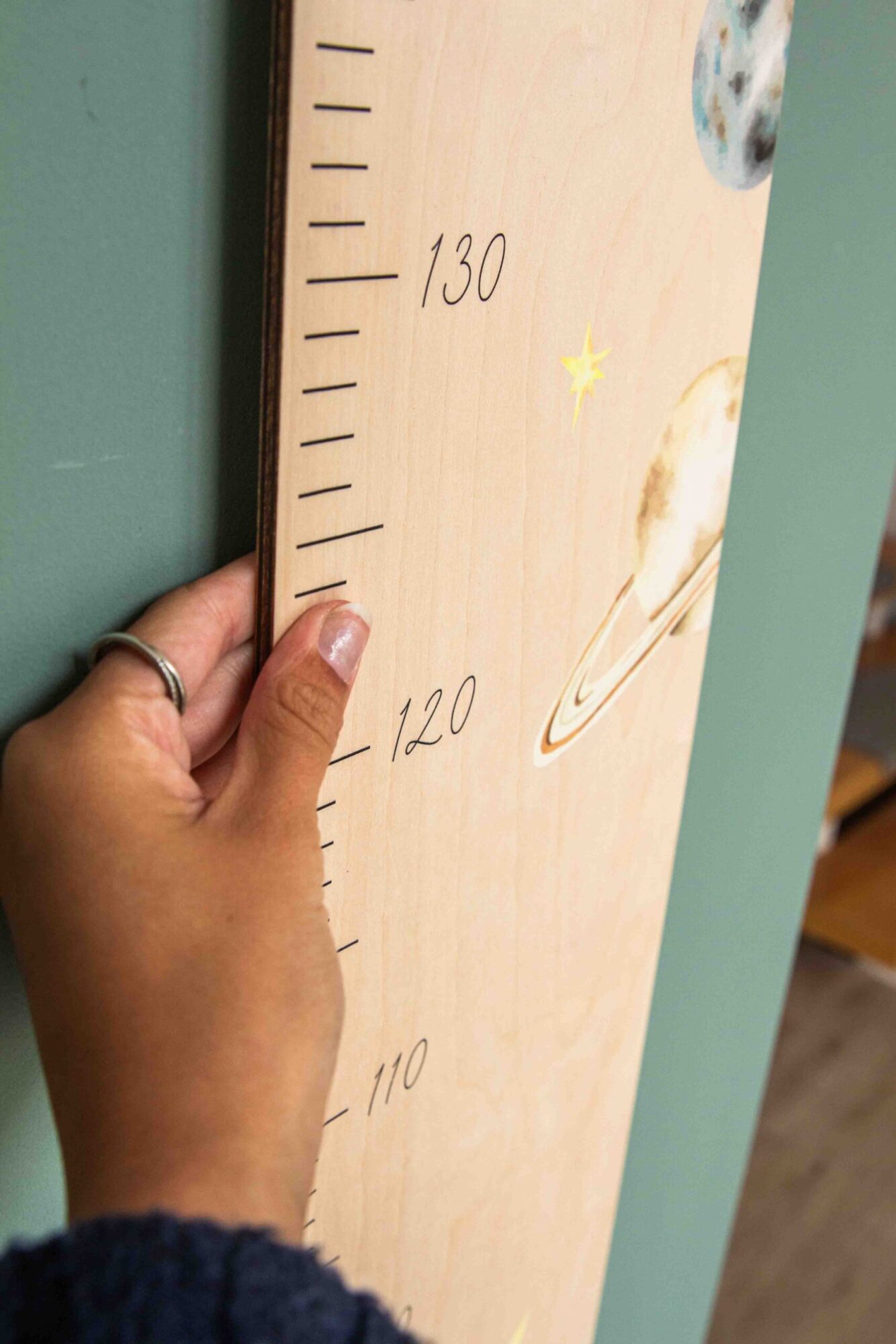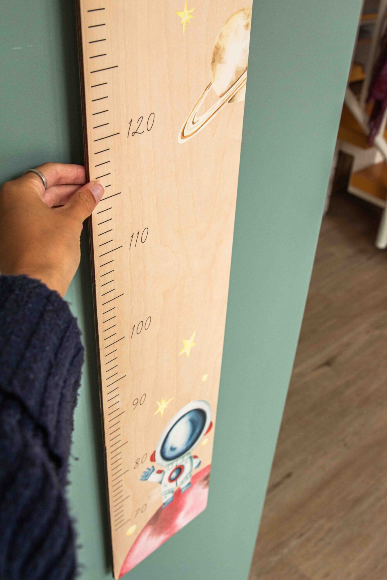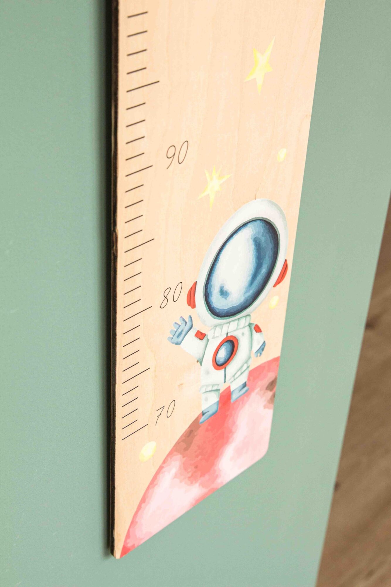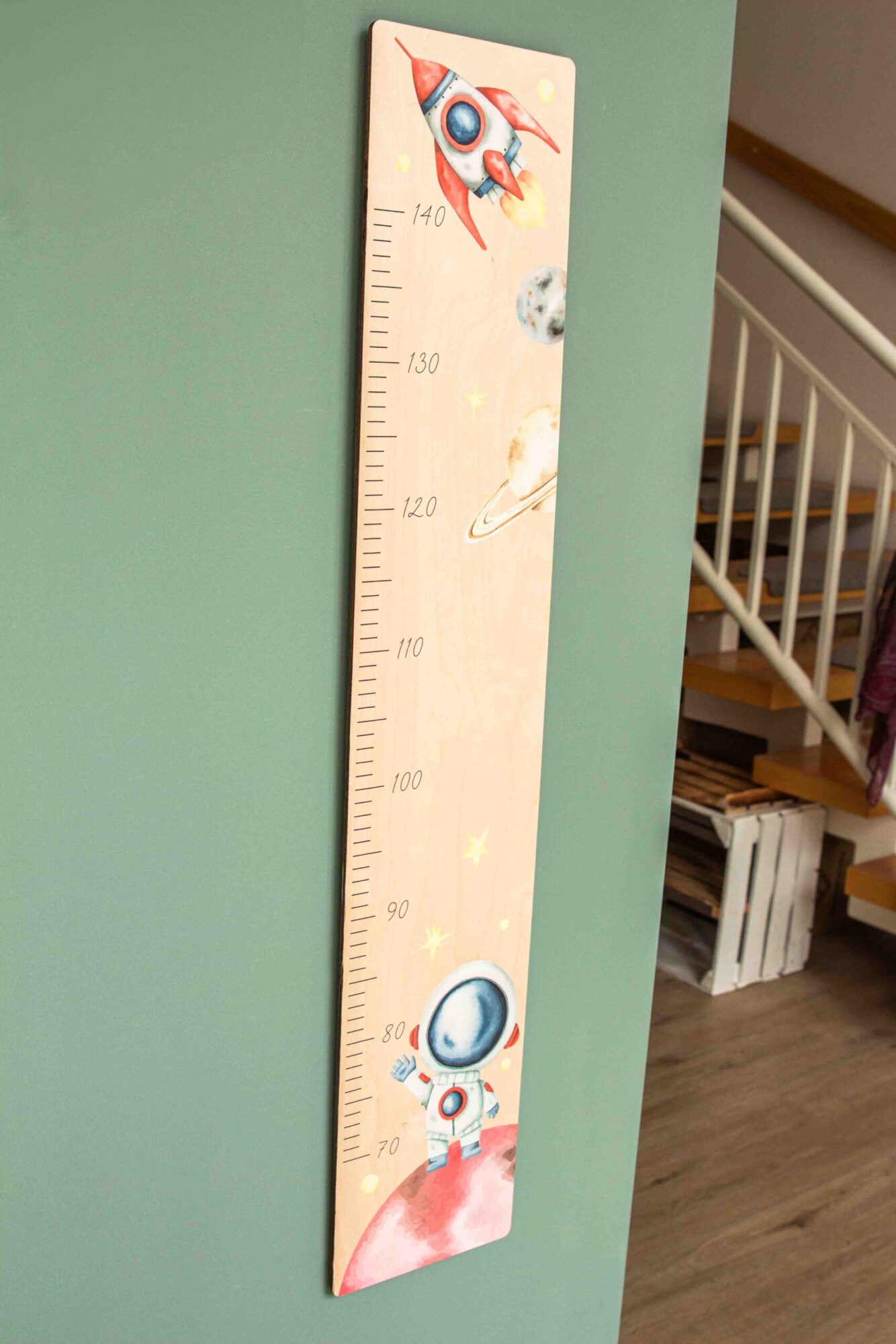 Eine Messlatte, im Weltall-Look, passend zu unserer Erinnerungsbox im selben Design.