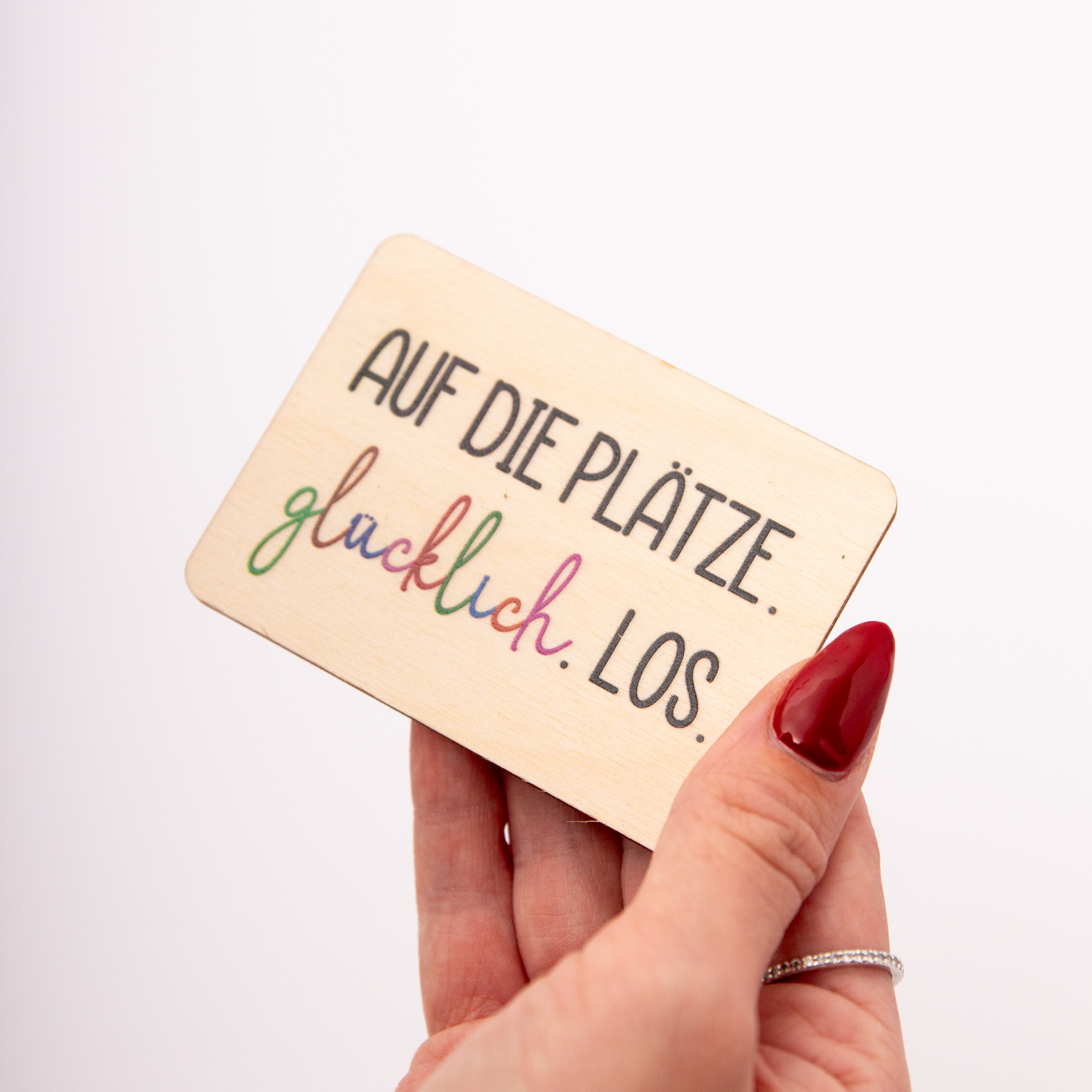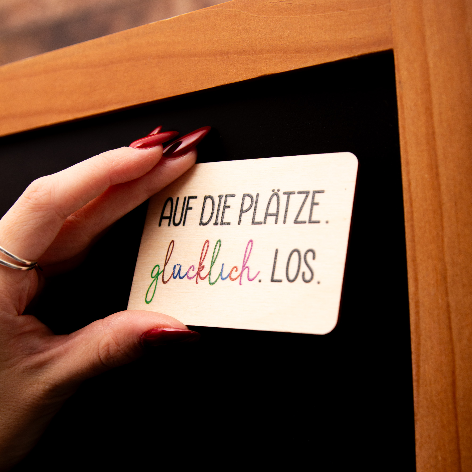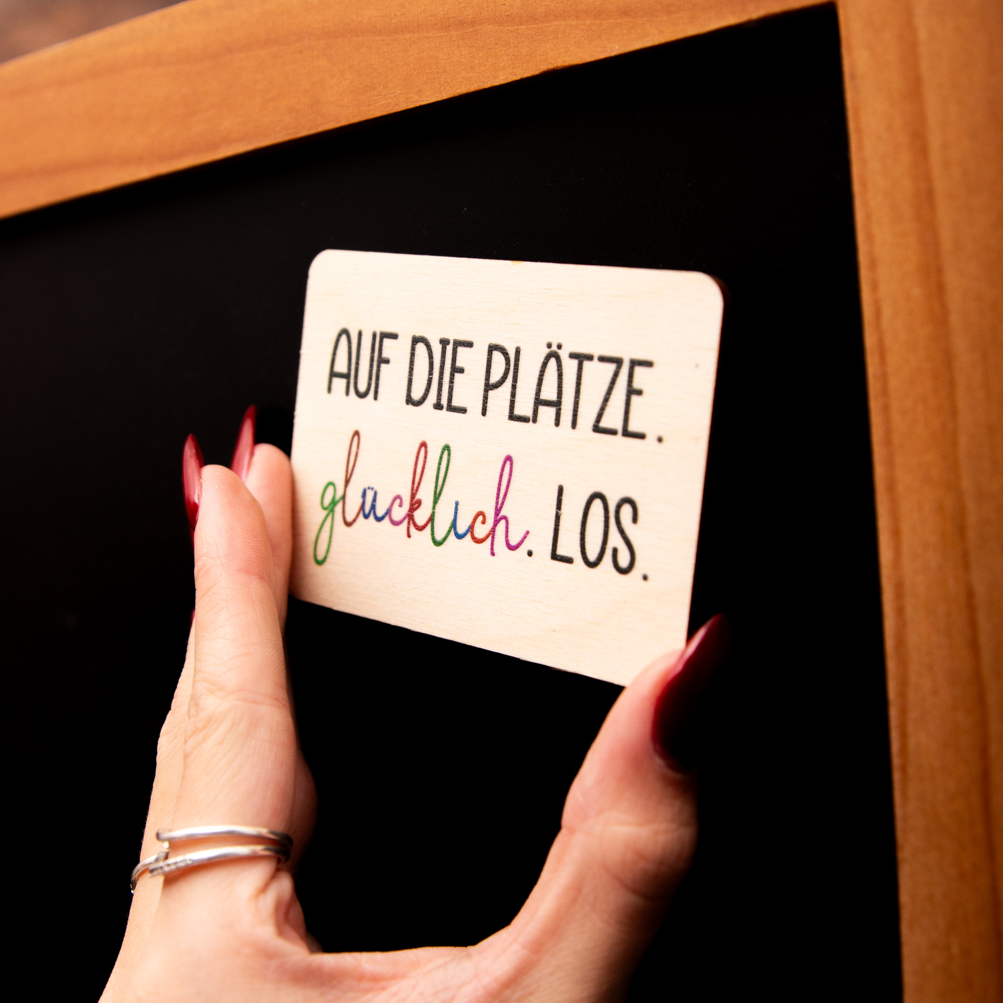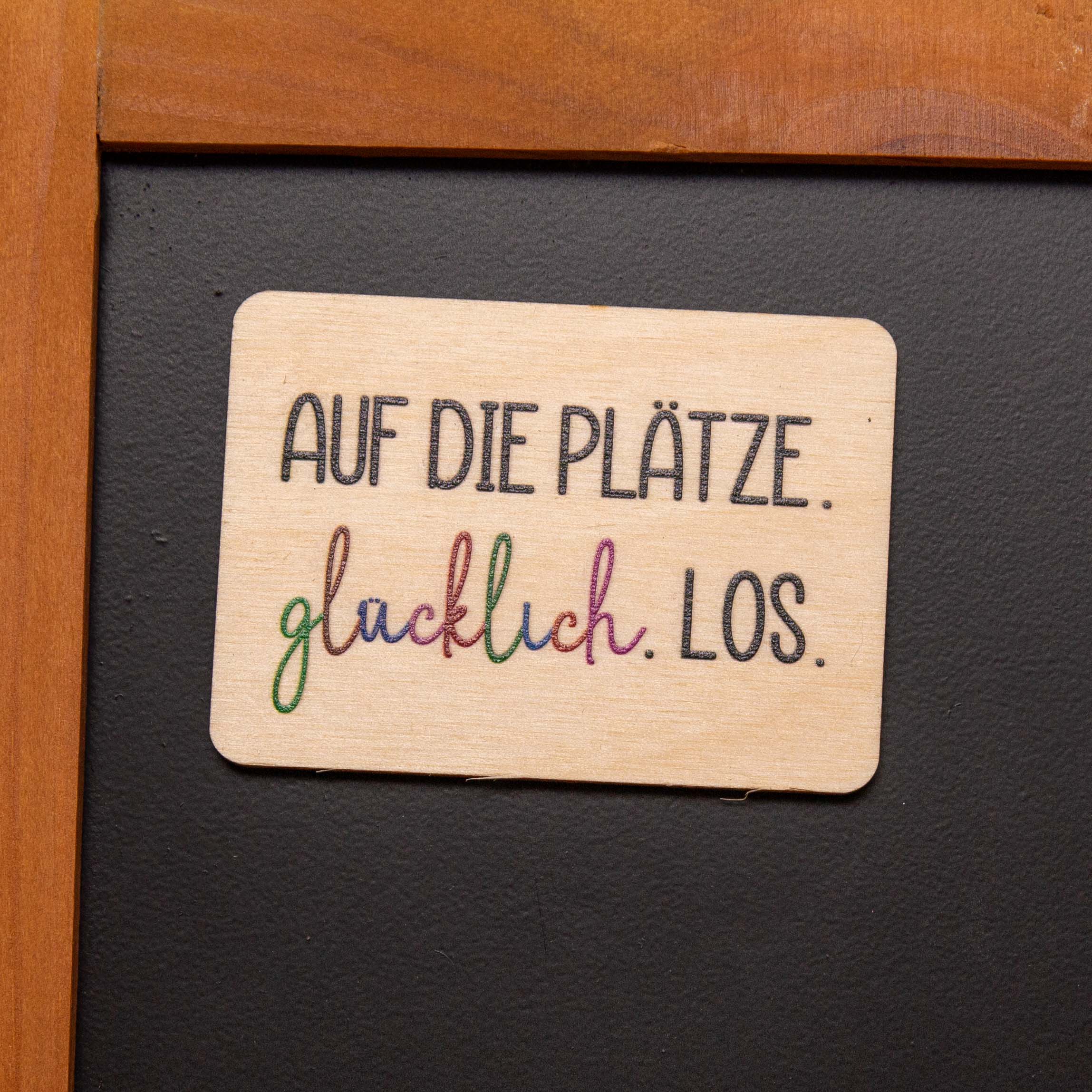 Holzmagnet „Auf die Plätze glücklich los“ – Motivierender Kühlschrankmagnet – Geschenk zur Aufmunterung & Motivation – Made in Leipzig