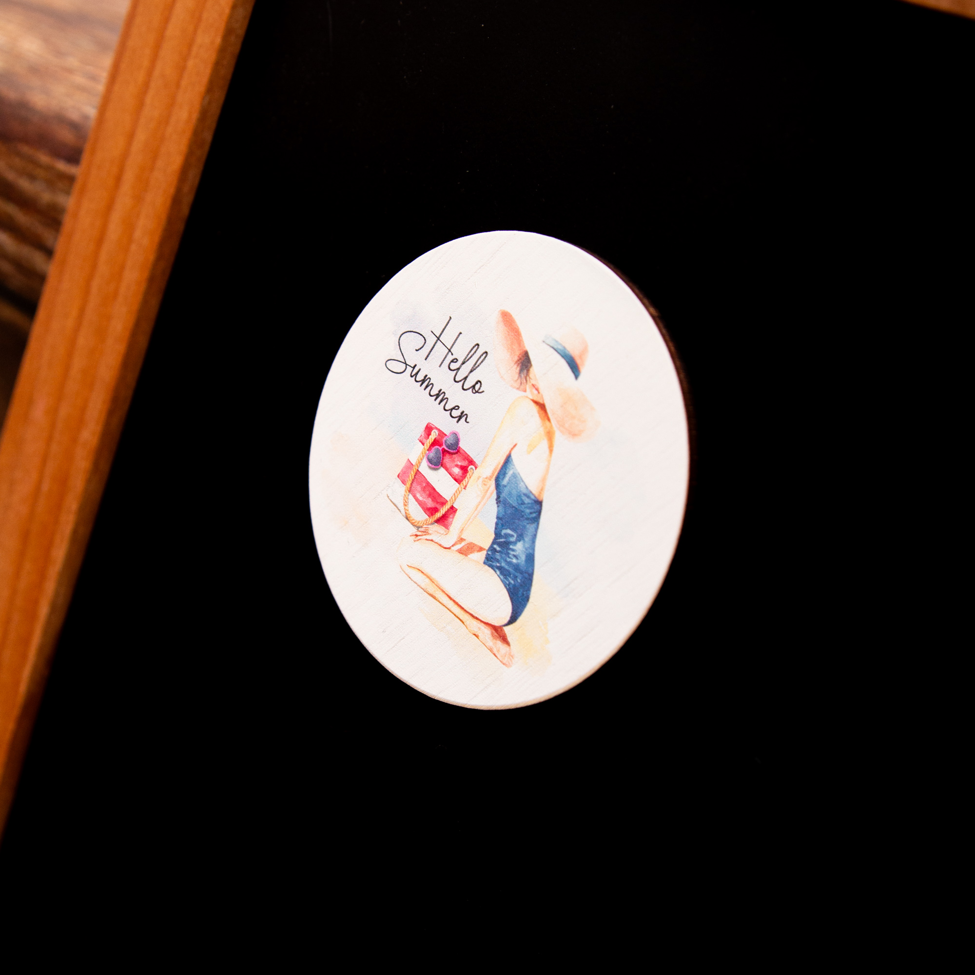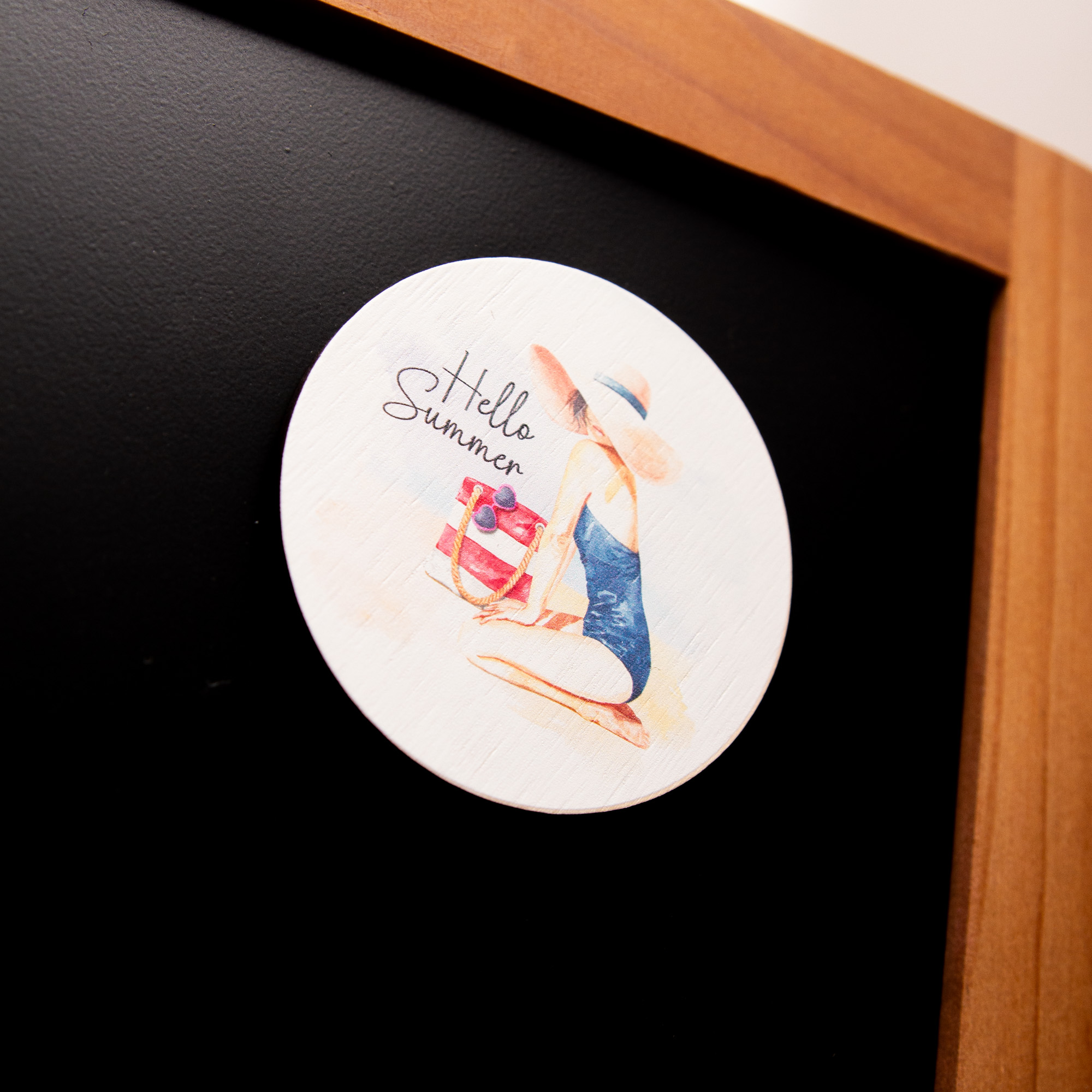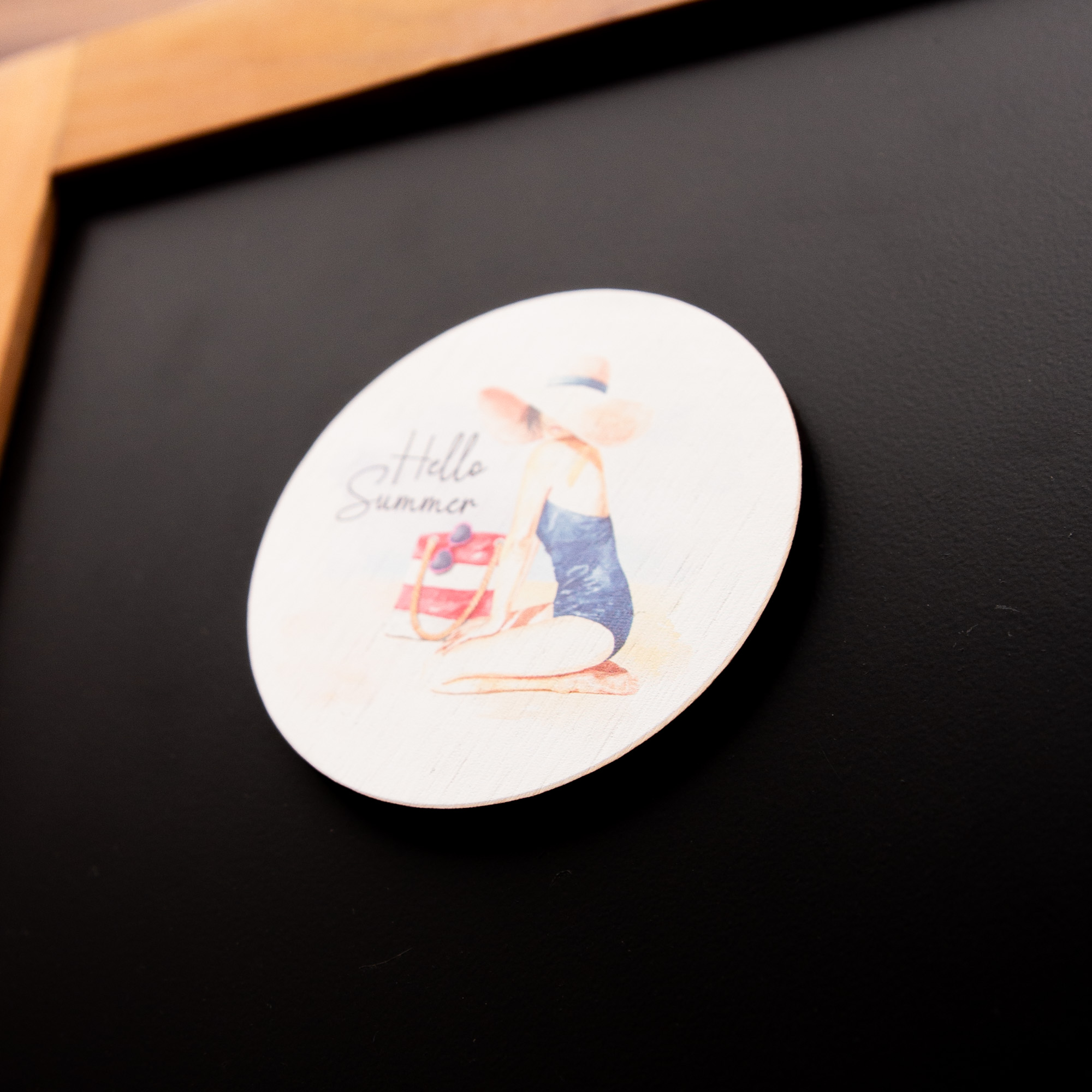 Holzmagnet „Hello Summer“ rund – Maritimer Kühlschrankmagnet Frau am Strand – Sommerdeko & Geschenk aus Holz – Made in Leipzig