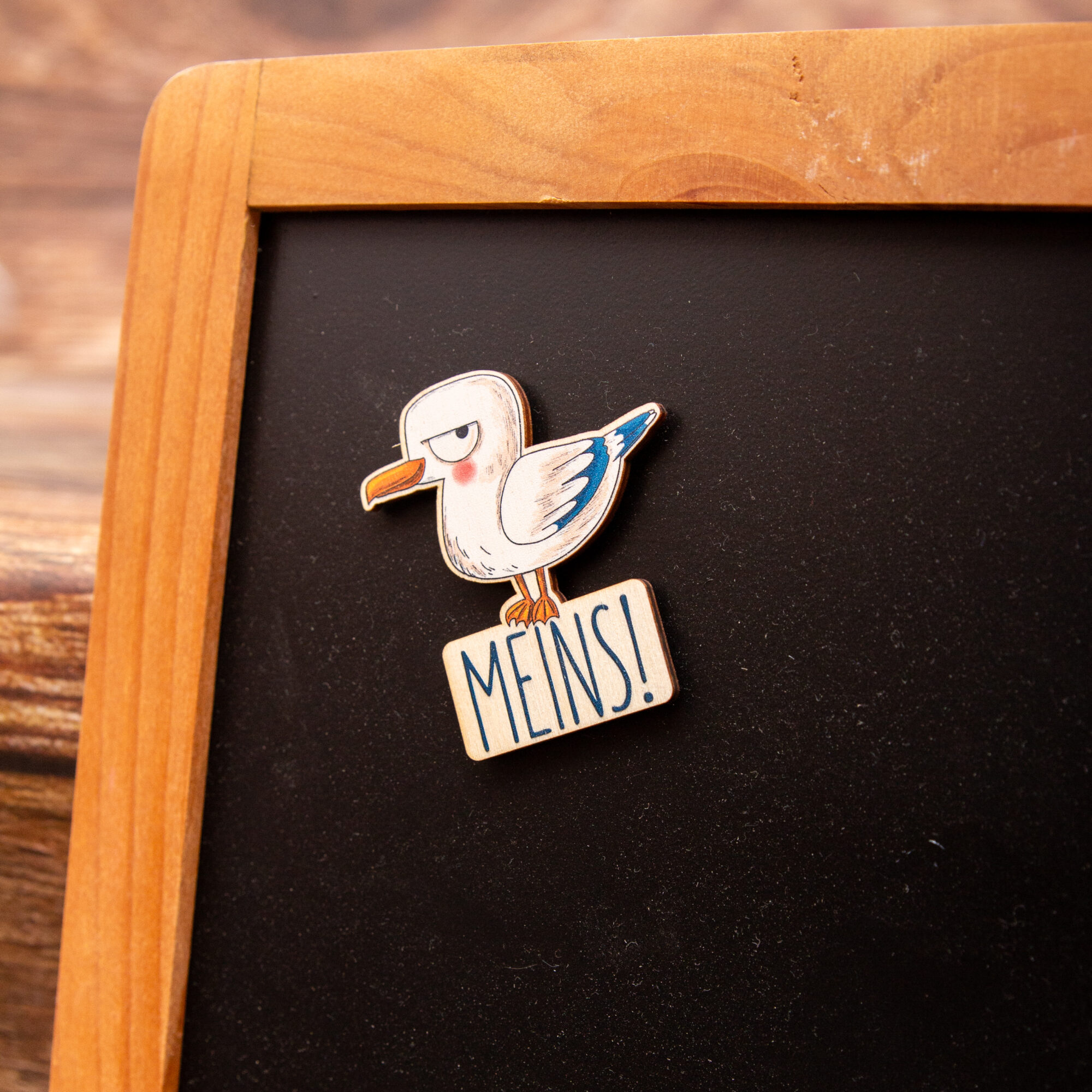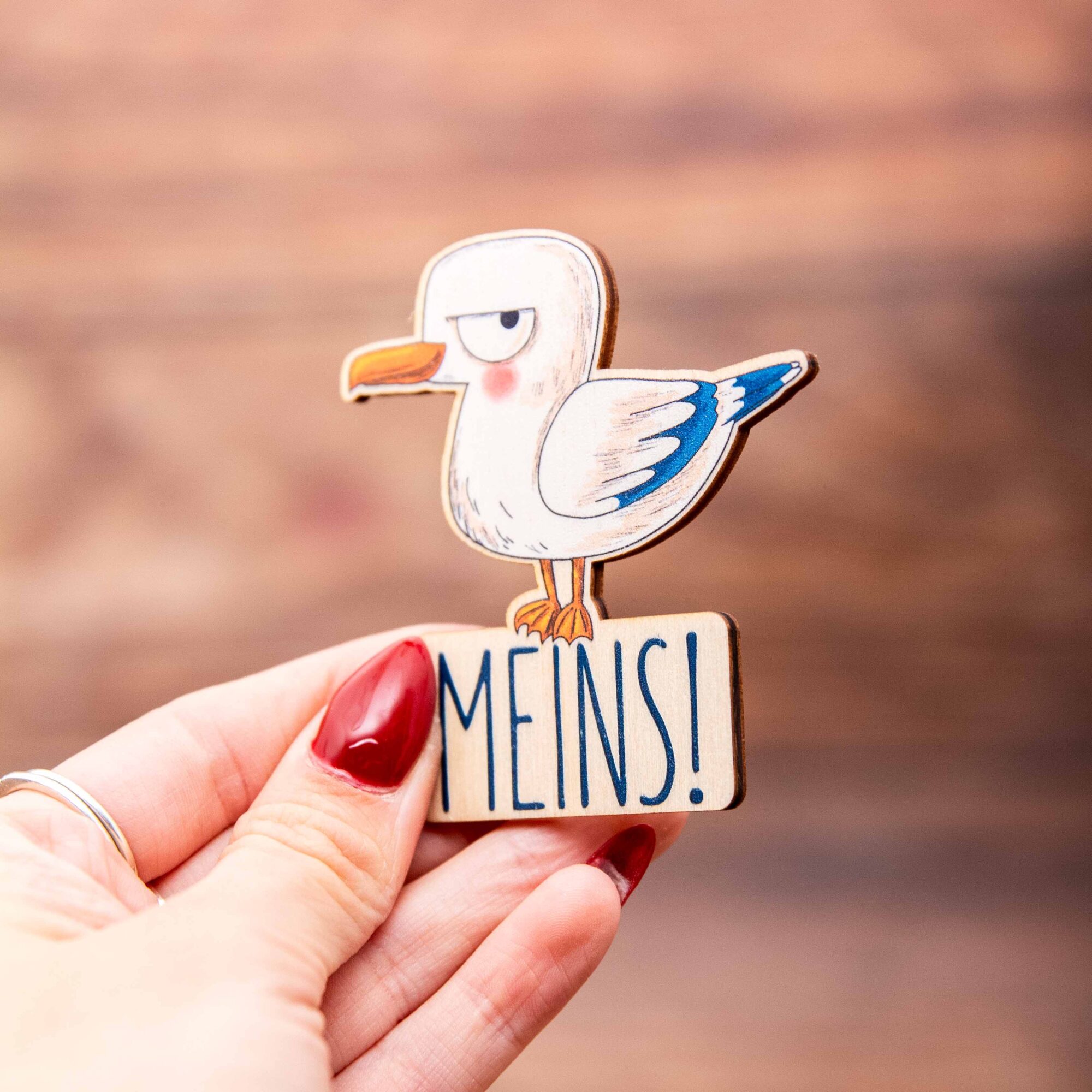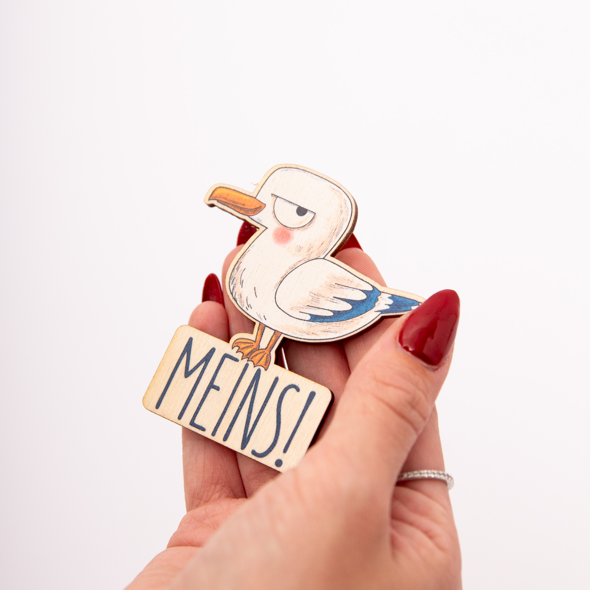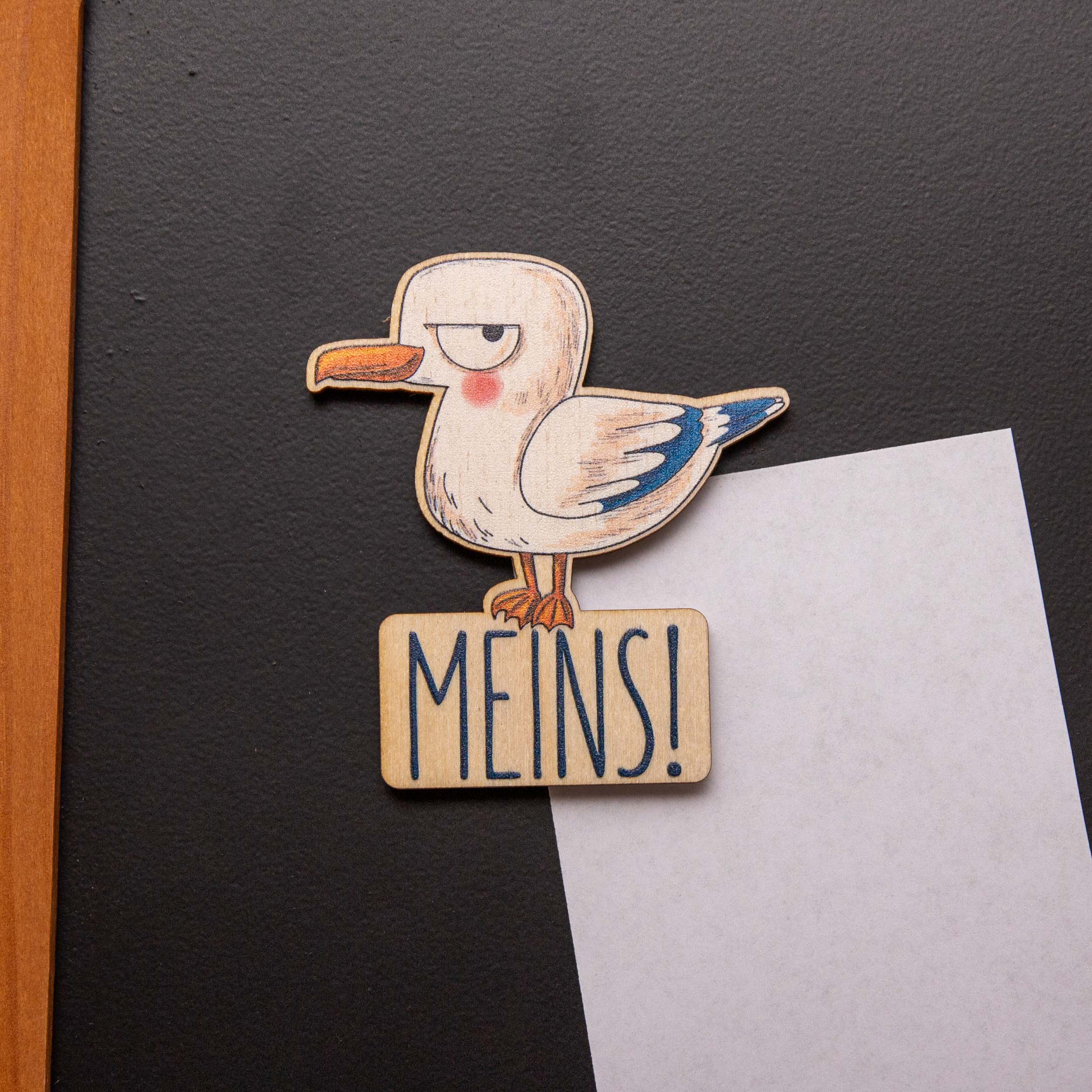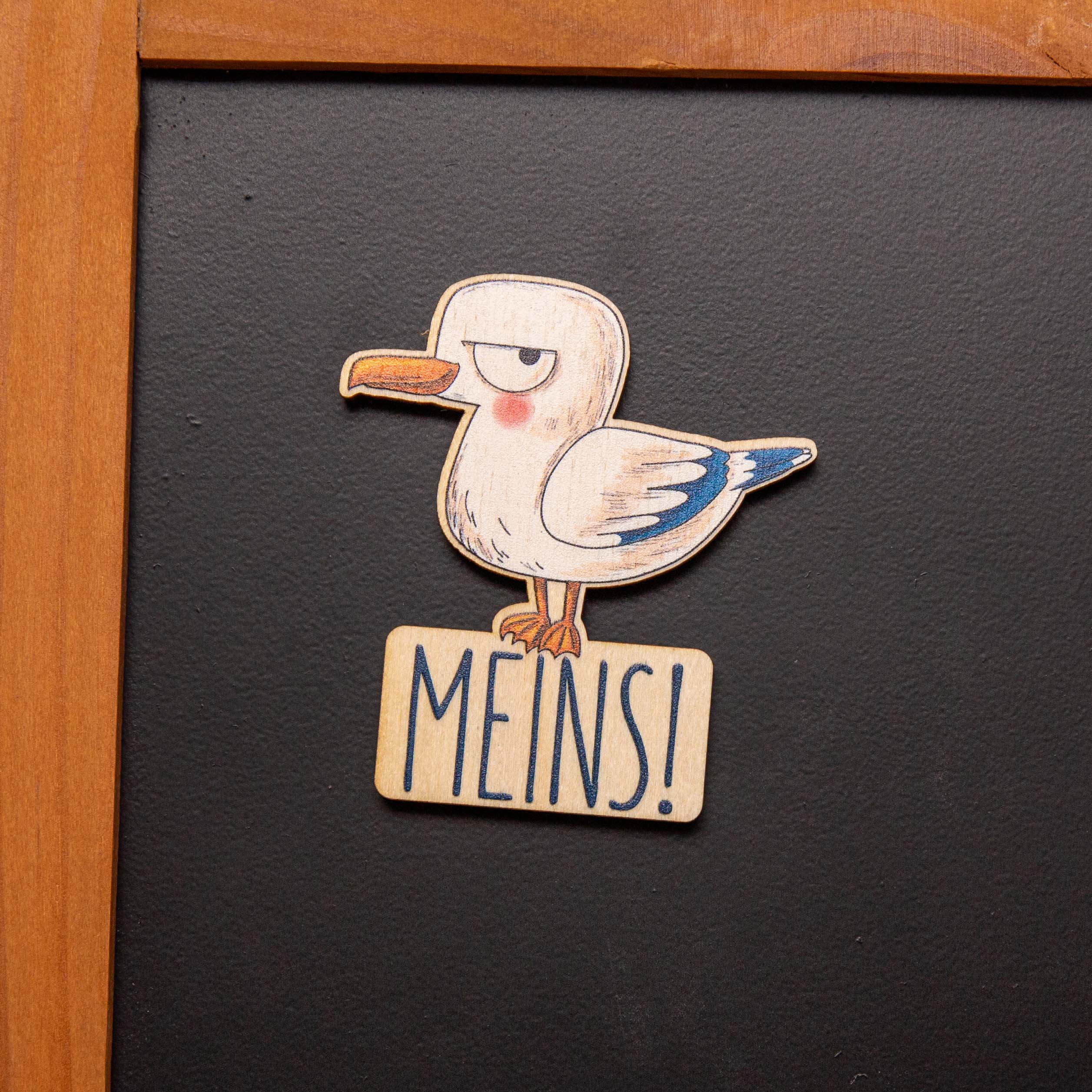 Holzmagnet Möwe „MEINS“ rund – Lustiger Kühlschrankmagnet maritim – Geschenk aus Birkenholz – Made in Leipzig