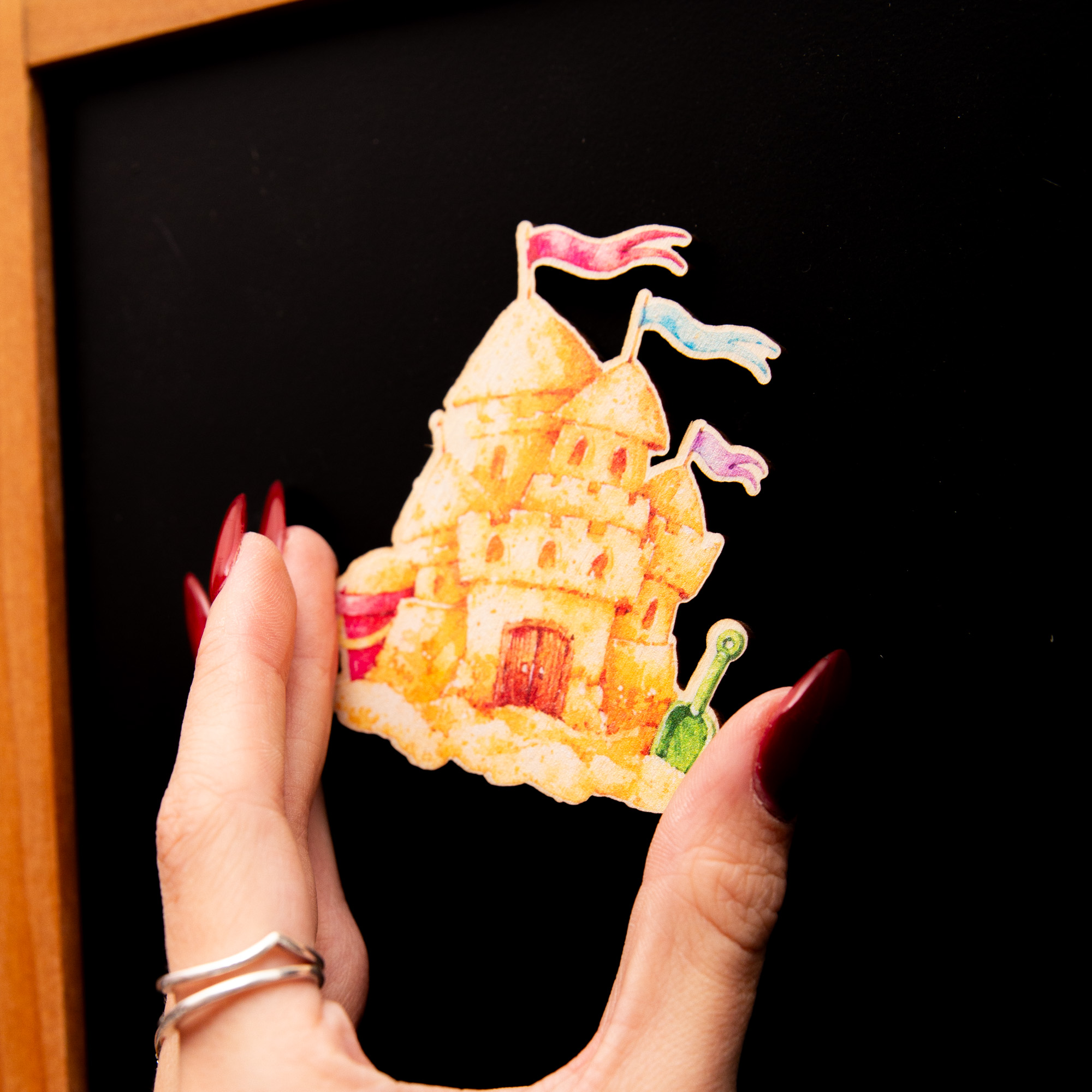 Wer hat als Kind nicht davon geträumt, die perfekte Burg am Flutsaum zu bauen? Unser runder Holzmagnet mit dem detailreichen Sandburg-Motiv bringt die unbeschwerte Leichtigkeit warmer Sommertage direkt an deine Kühlschranktür. Er ist das perfekte Accessoire für alle Strandläufer, Burgenbauer und Küstenverliebten, die sich ein Stück Urlaubsflair in den Alltag holen wollen.