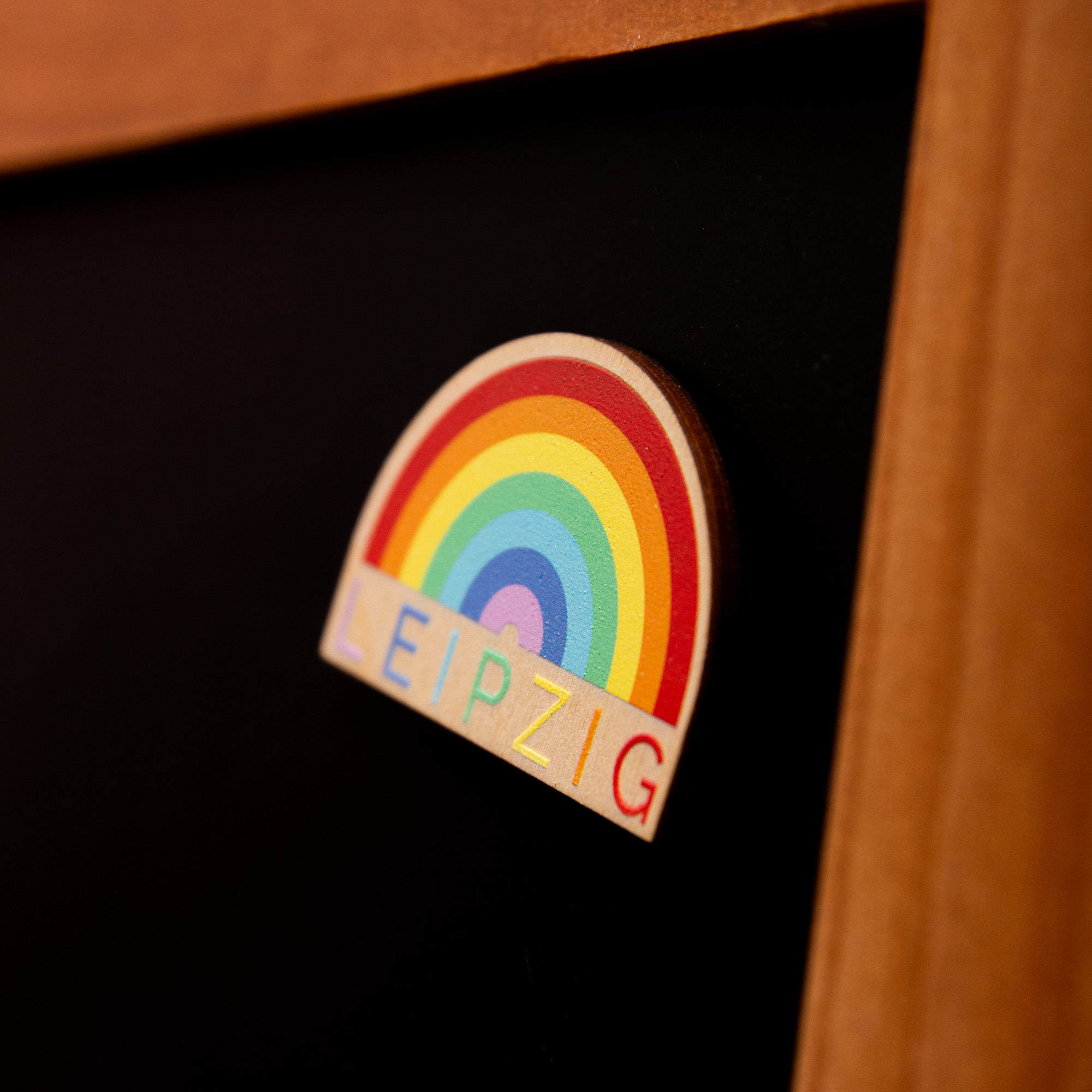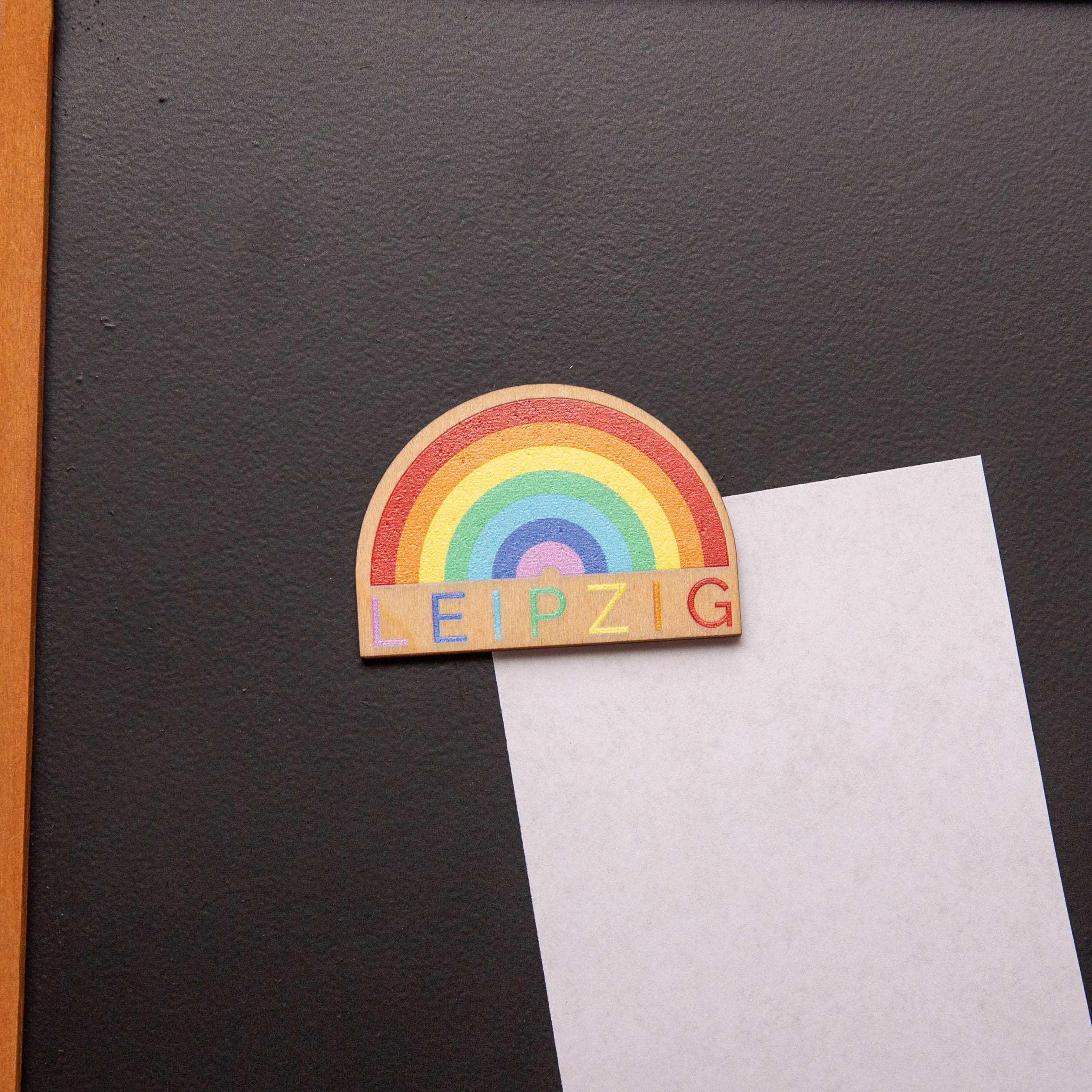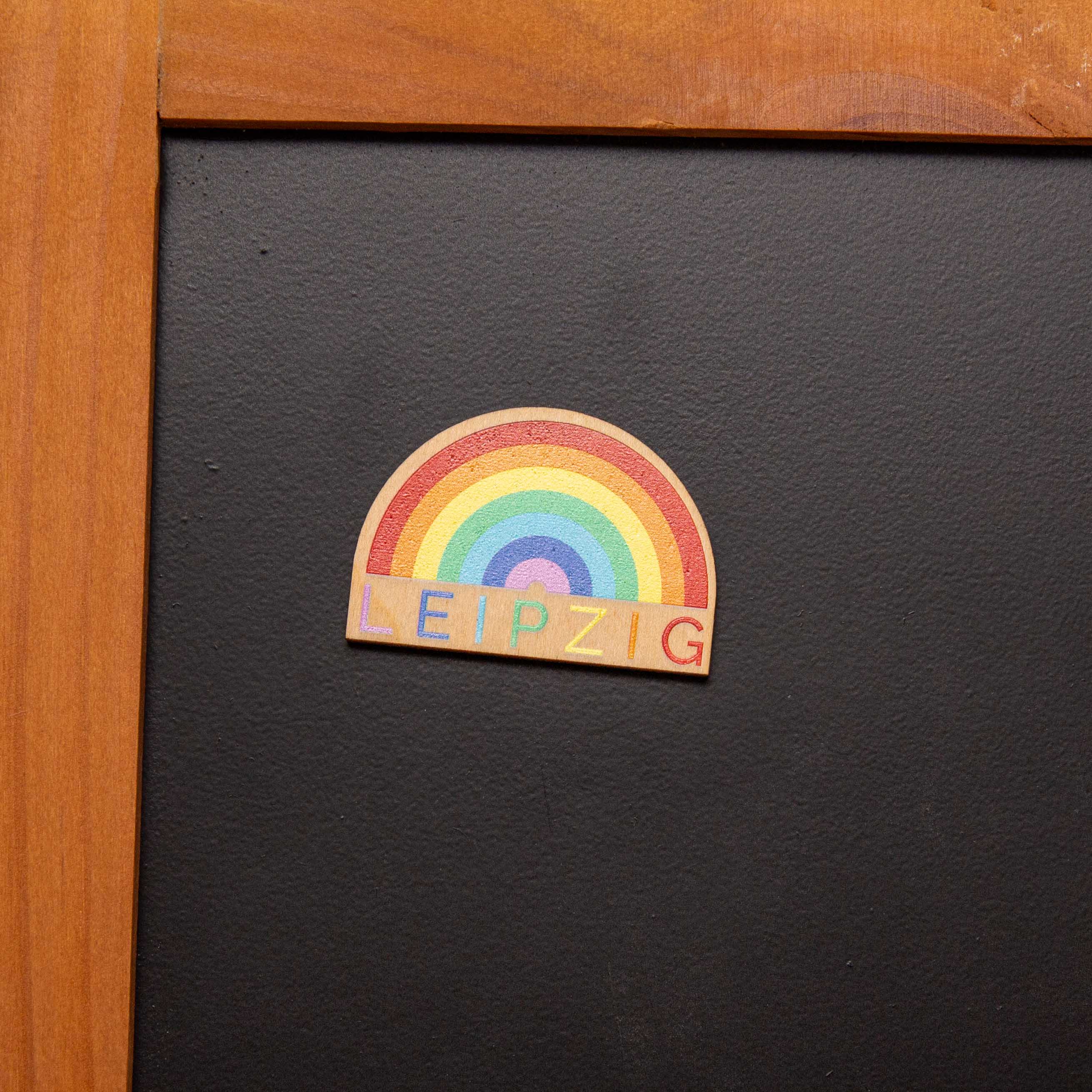 Personalisierter Holzmagnet Regenbogen & Wunschname – Individueller Kühlschrankmagnet rund – Geschenk Einzug & Heimatliebe – Made in Leipzig