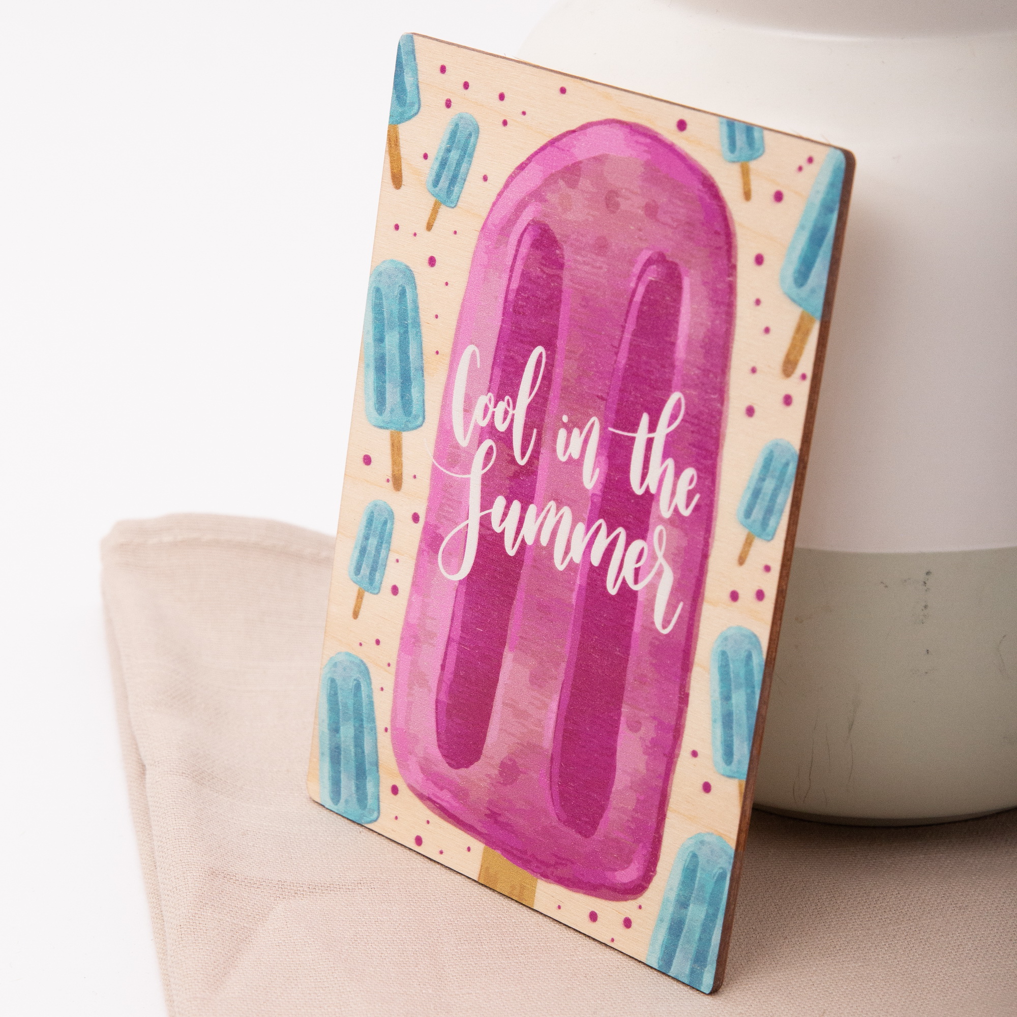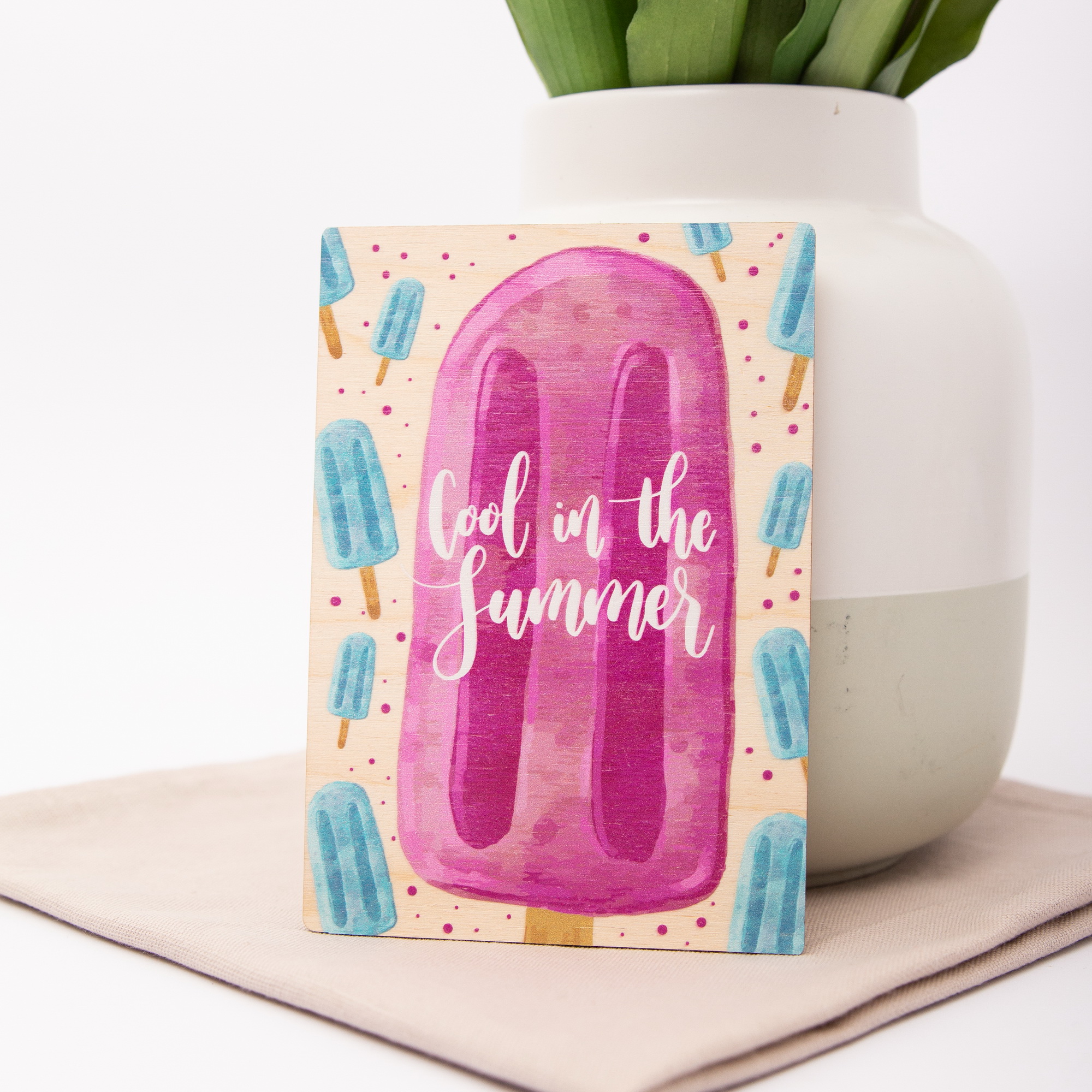 Hol dir den Sommer nach Hause! Unsere Holzpostkarte mit dem bunten Wassereis-Motiv und dem lässigen Schriftzug „Cool in the Summer“ ist die perfekte Botschaft für heiße Tage. Ob als Einladung zur Poolparty, als kleiner Feriengruß für Freunde oder einfach als stylische Sommer-Deko für deinen Kühlschrank – diese Karte aus echtem Holz verbreitet sofort gute Laune und bleibt garantiert länger cool als jedes echte Eis.