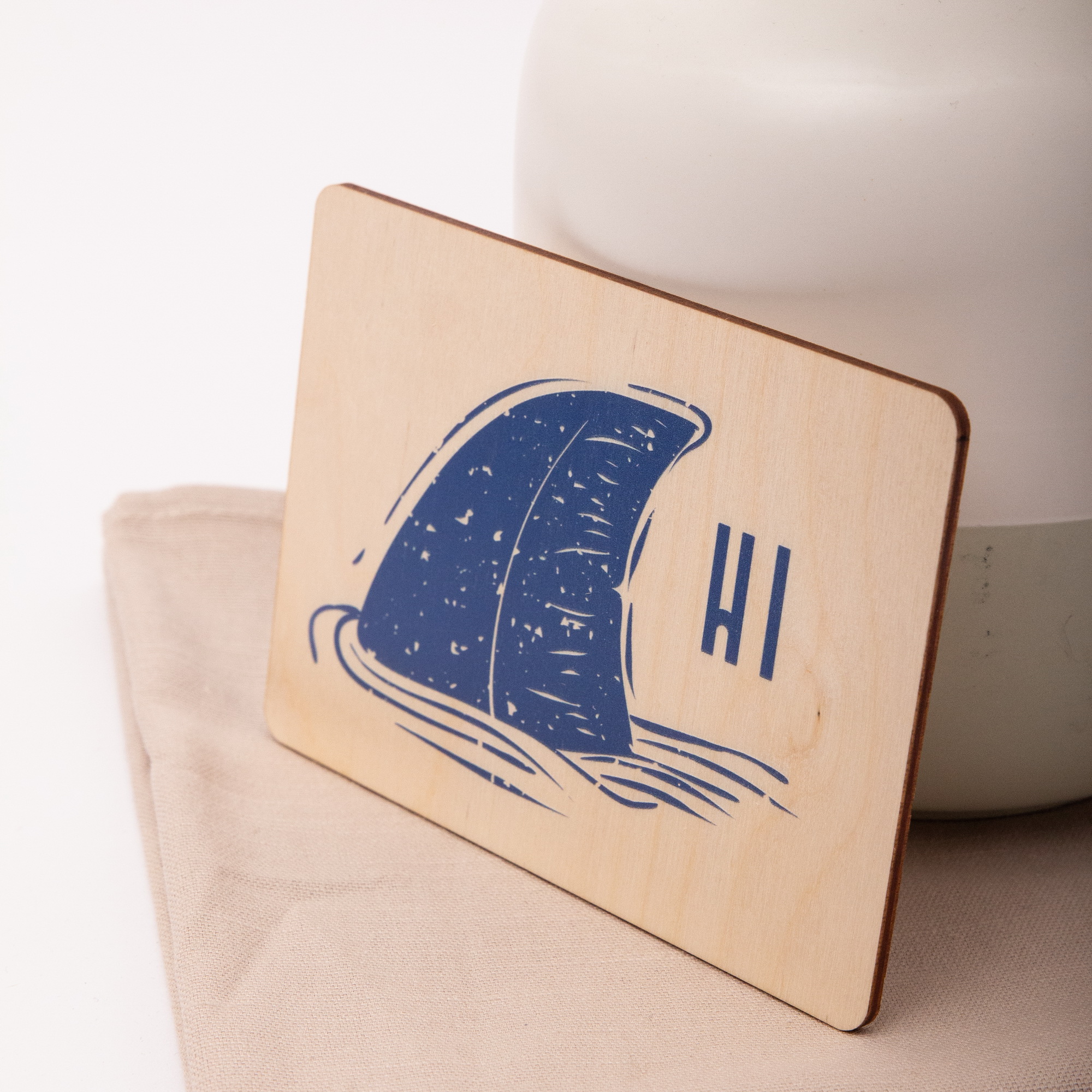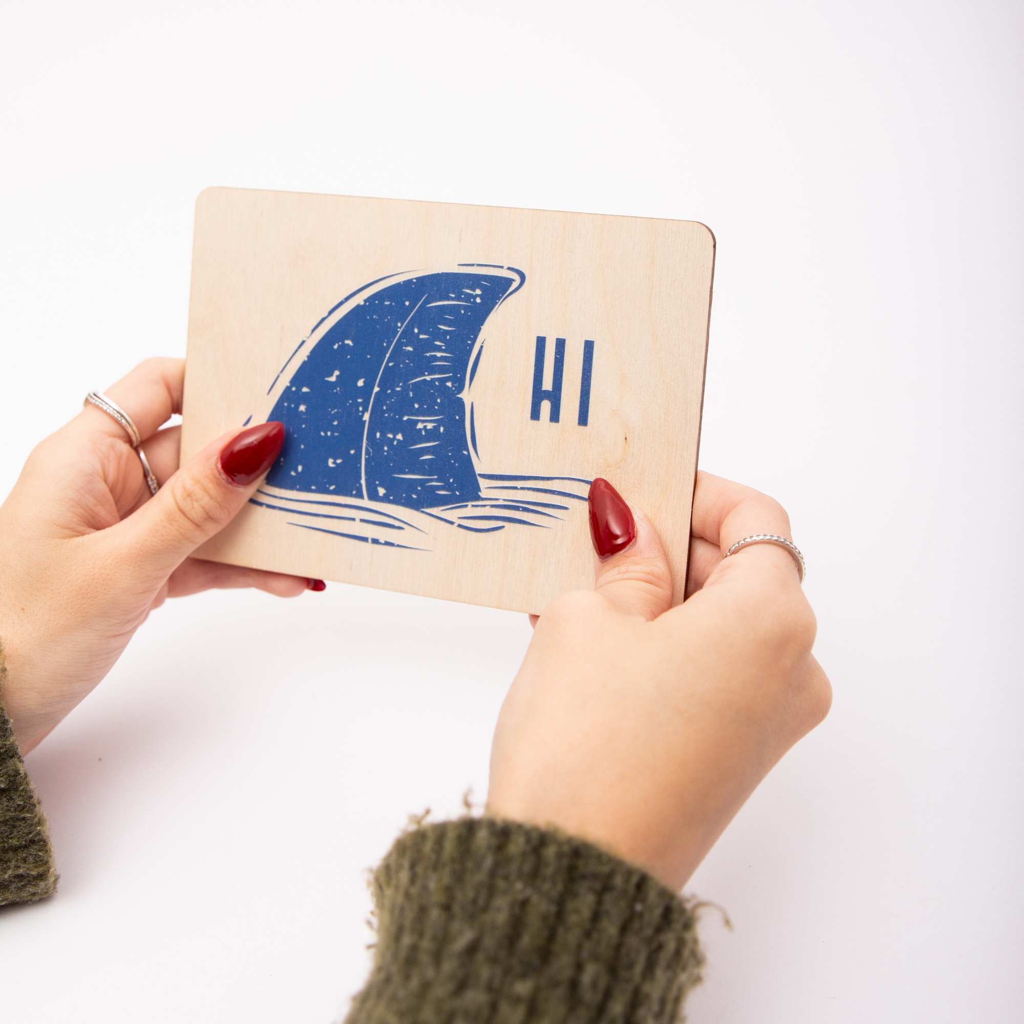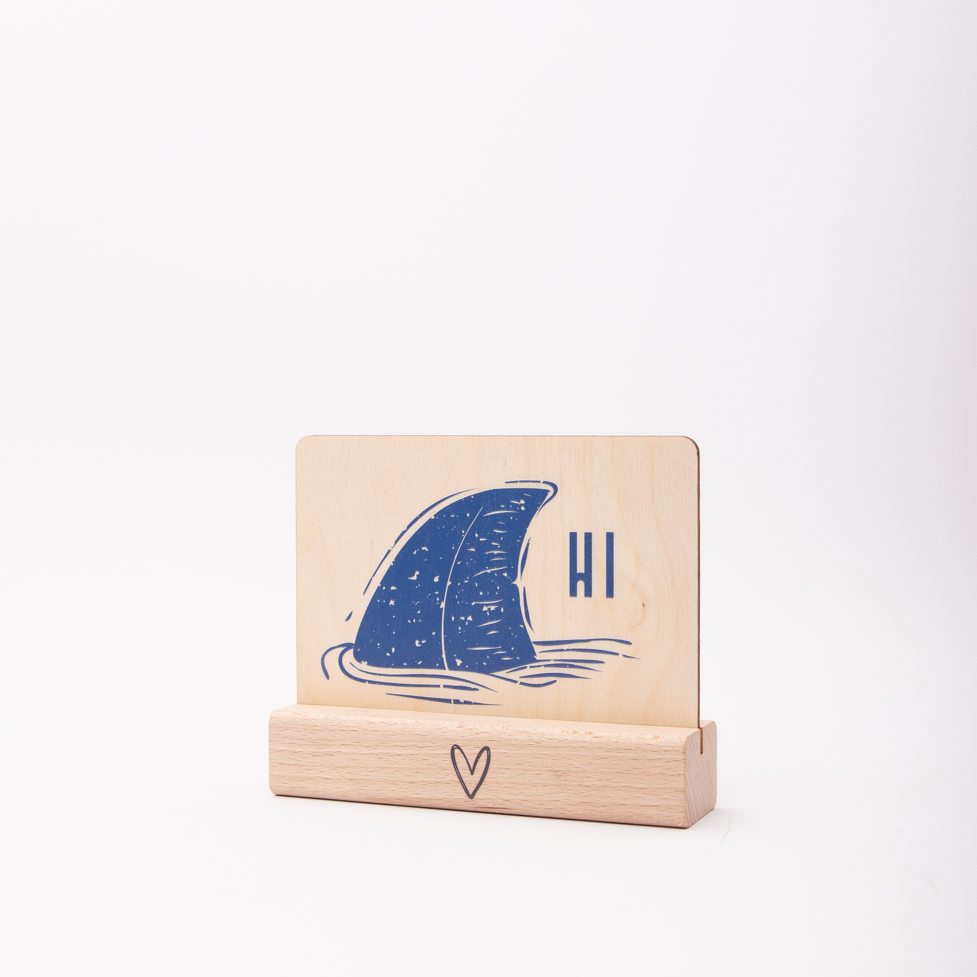 Produktbeschreibung: Holzpostkarte „Hi“ – Ein shark-starker Gruß aus echtem Holz