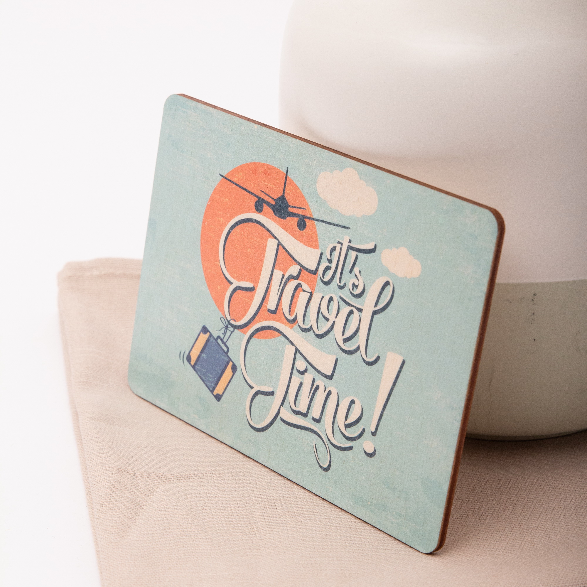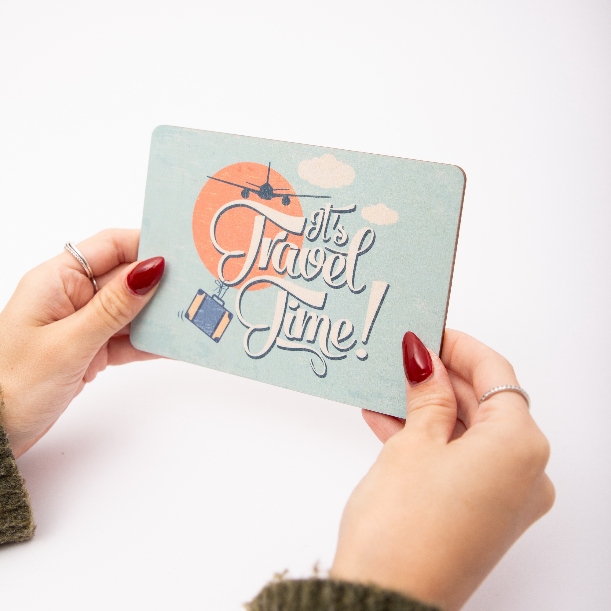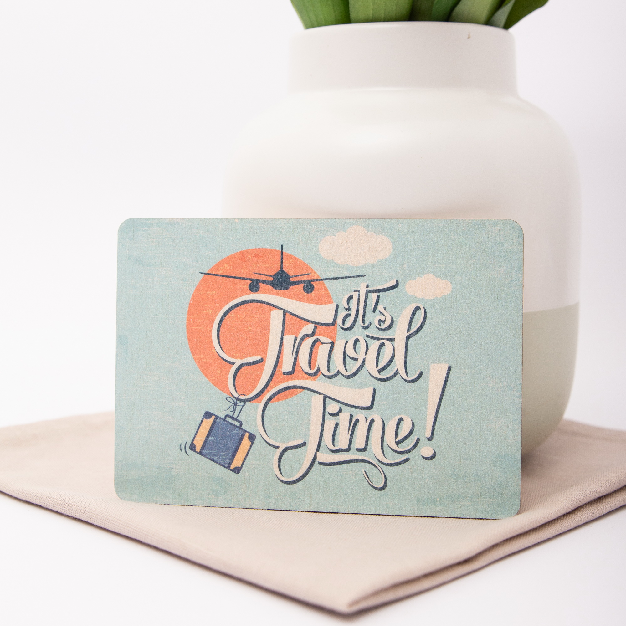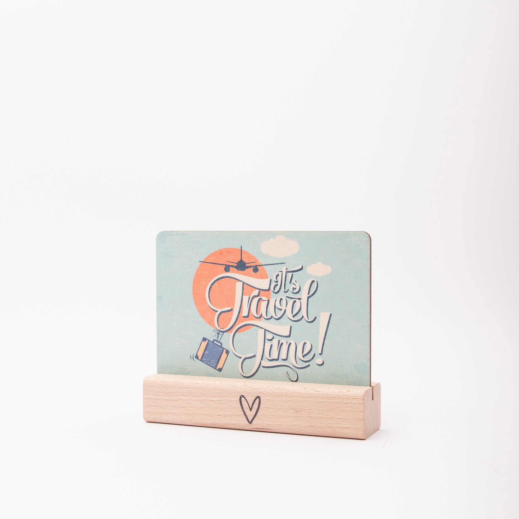 Holzpostkarte „It’s travel time“ – Reise & Urlaub Motiv – Geschenkidee Weltenbummler – Birkenholz A6