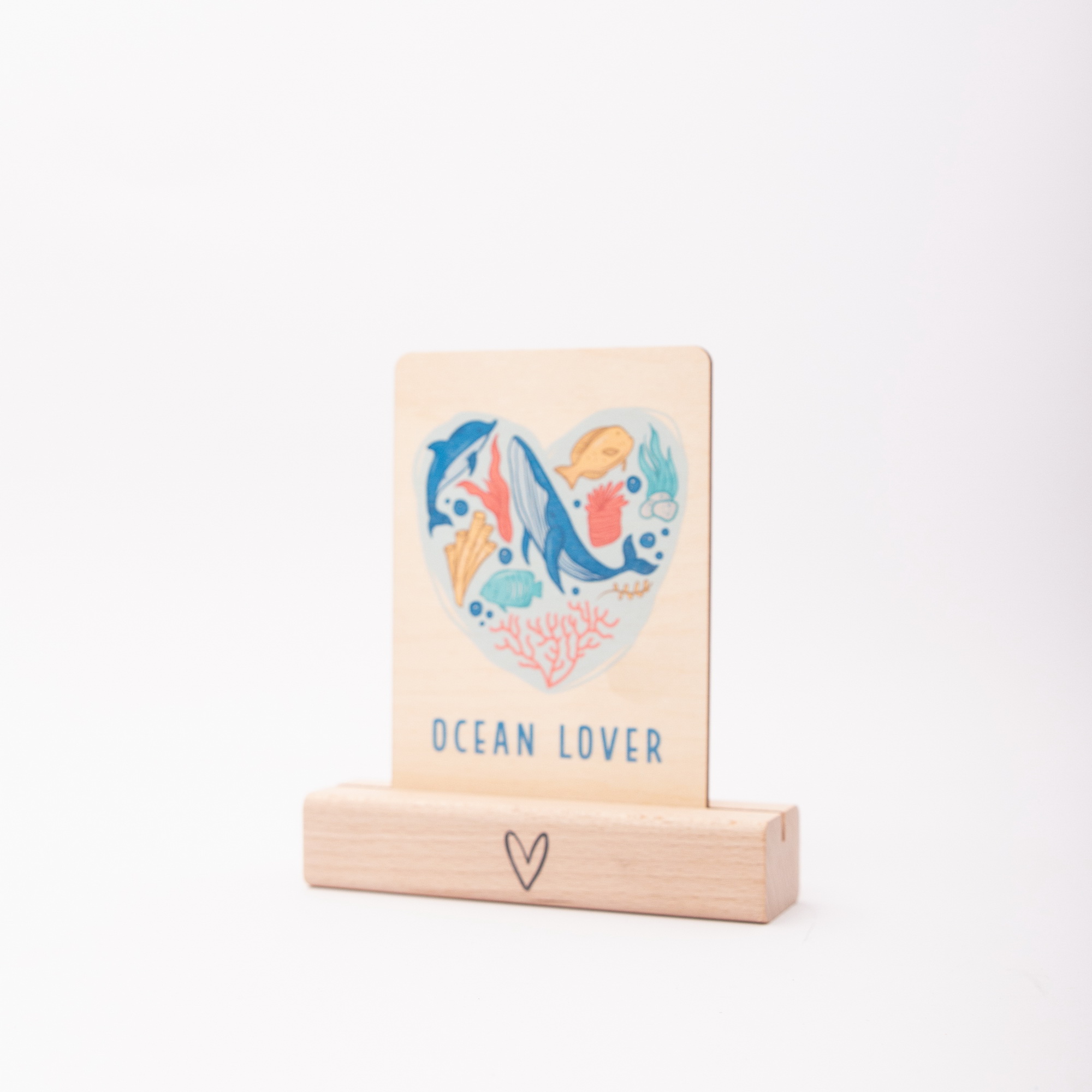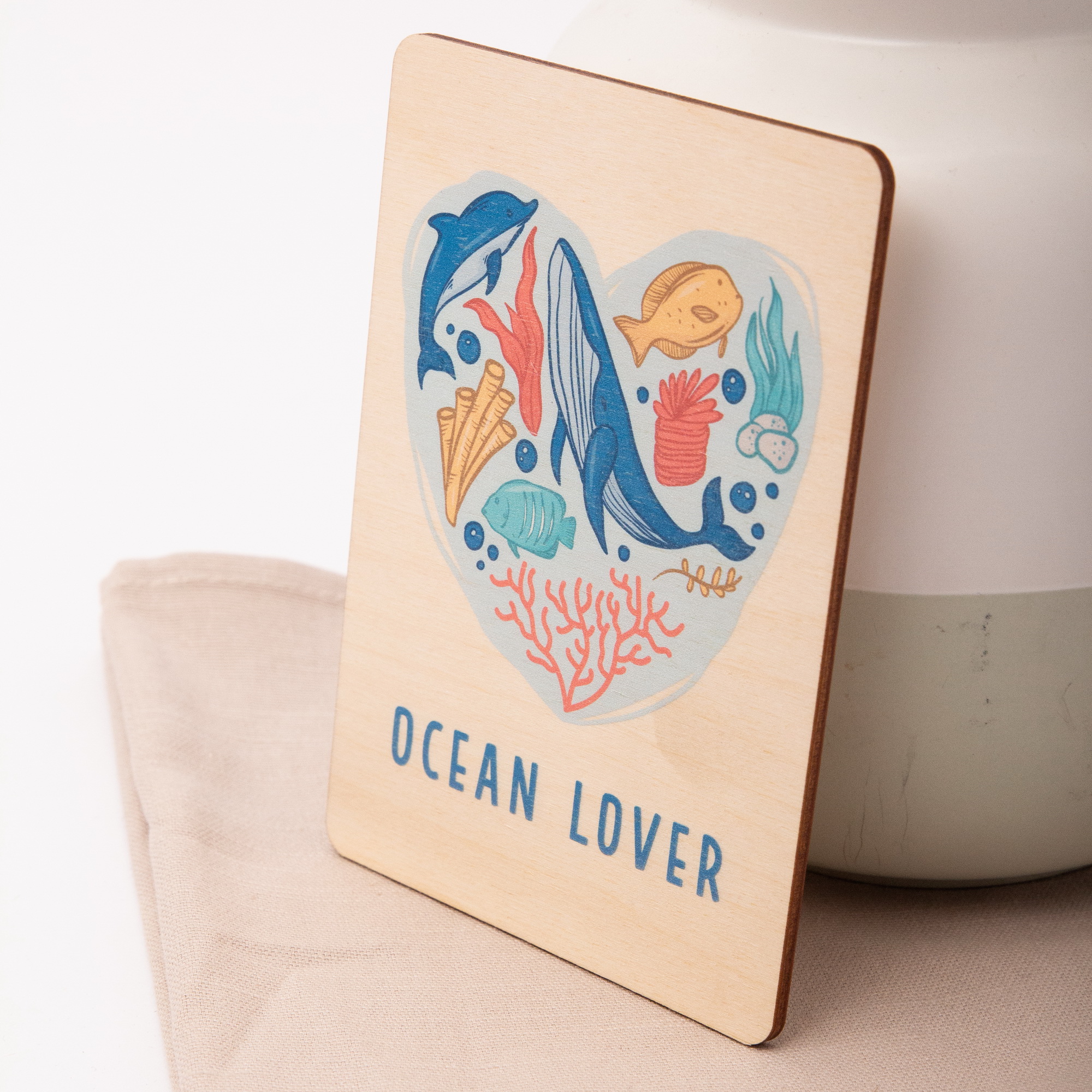 Holzpostkarte „Ocean Lover“ – Maritimes Herz-Motiv aus Birkenholz A6 – Geschenk für Meerverliebte & Küstenkinder
