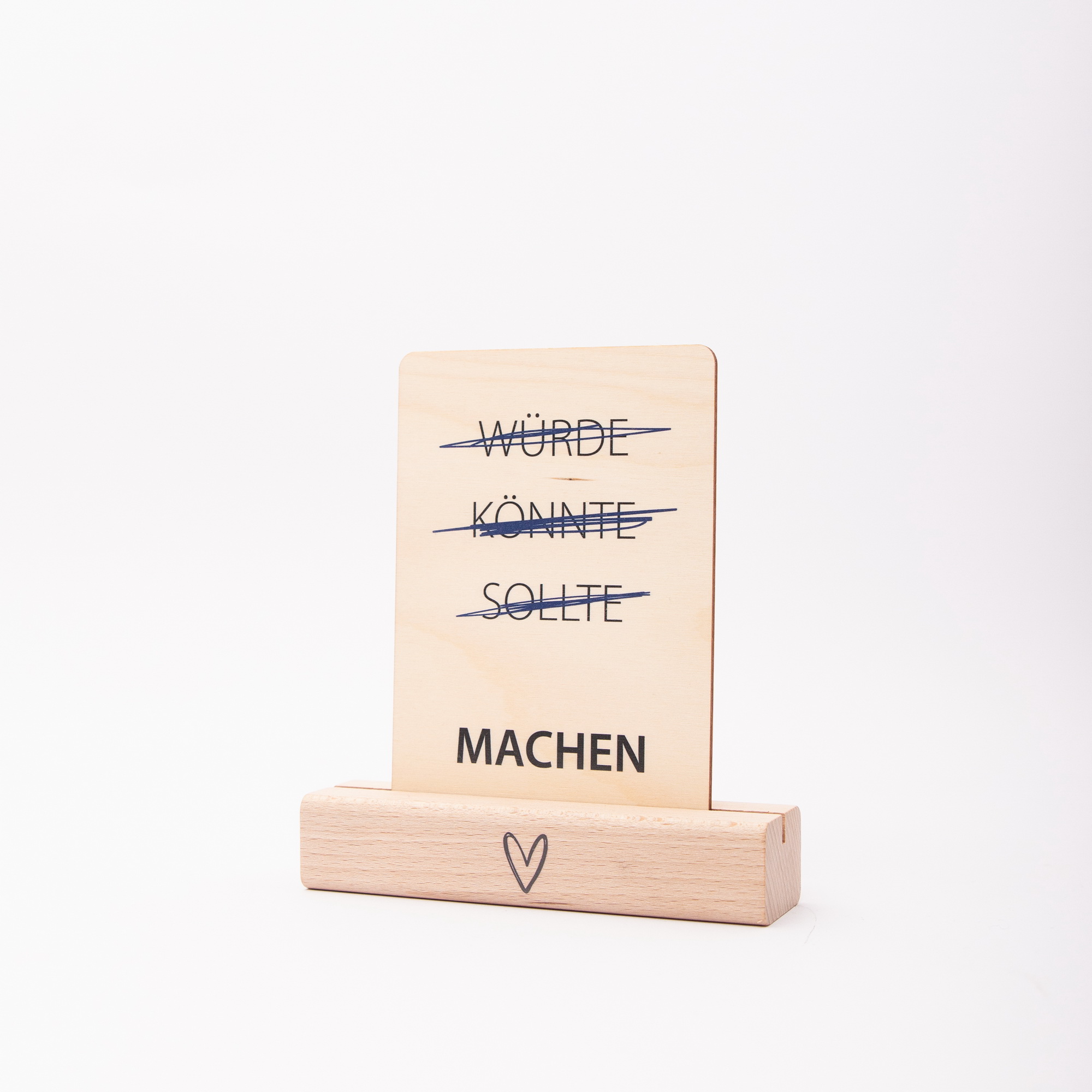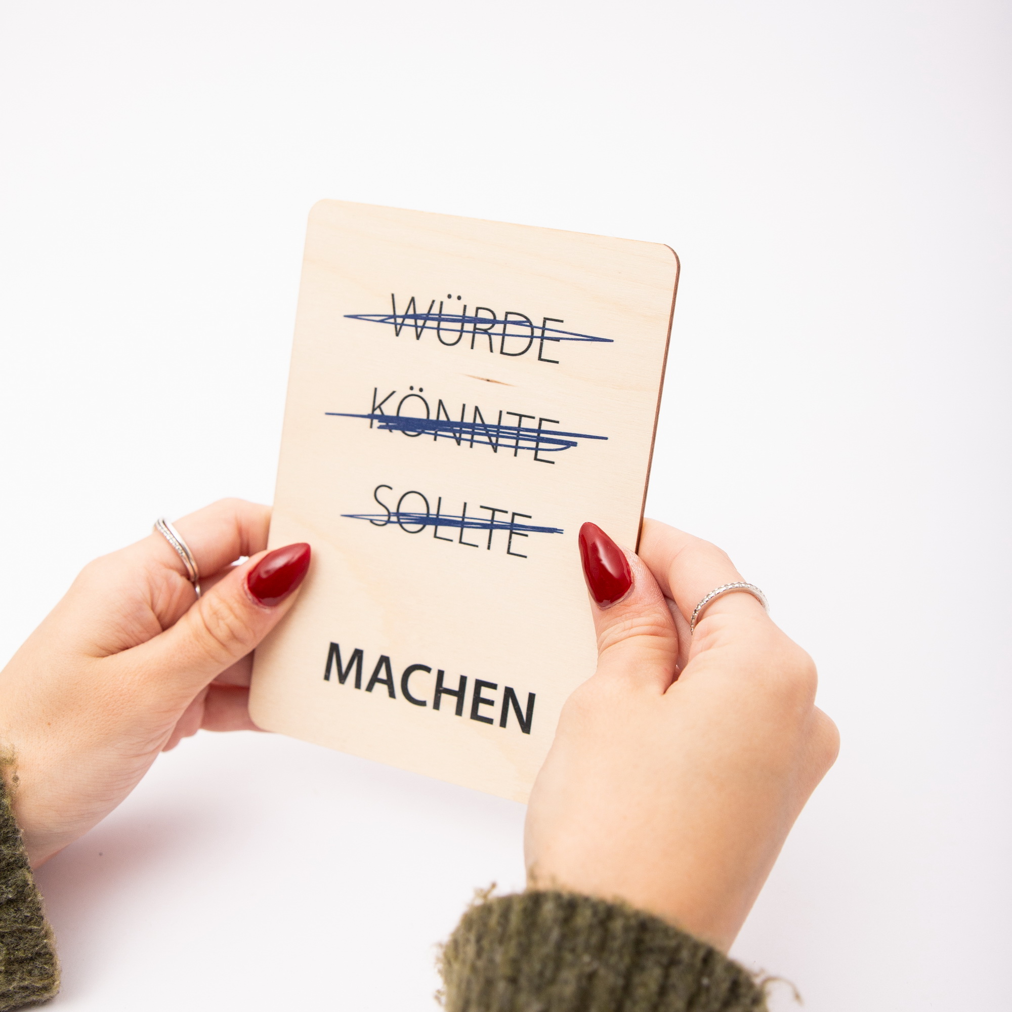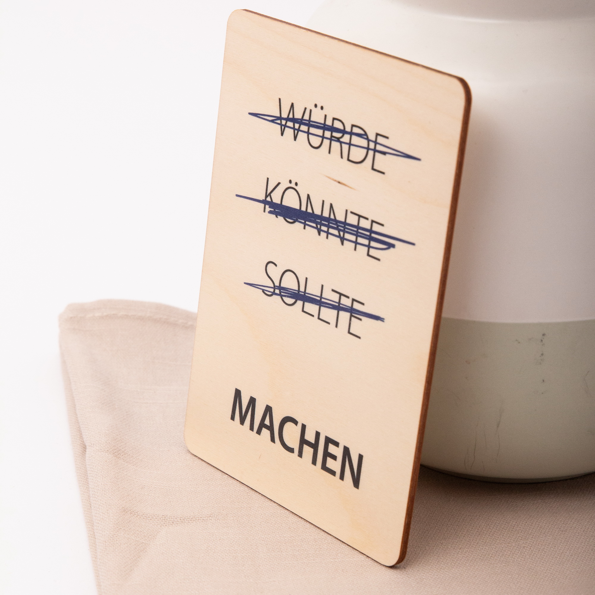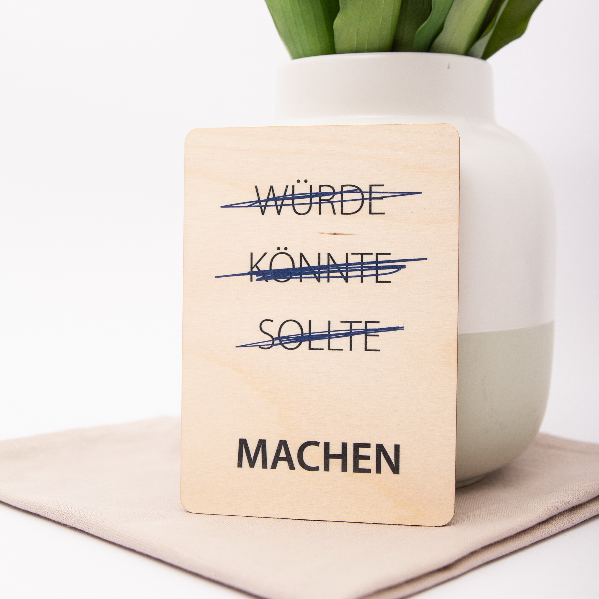 Schluss mit den Ausreden! Unsere Holzpostkarte mit dem starken Schriftzug „~~Würde, könnte, sollte,~~ MACHEN“ ist das perfekte Statement für alle Anpacker, Träumer und Zielsetzer. Ob als Motivationsschub für den neuen Job, zur Prüfung, als Neujahrsgruß oder einfach als täglicher Reminder am Schreibtisch – diese Karte aus echtem Holz ist so robust wie deine Pläne.