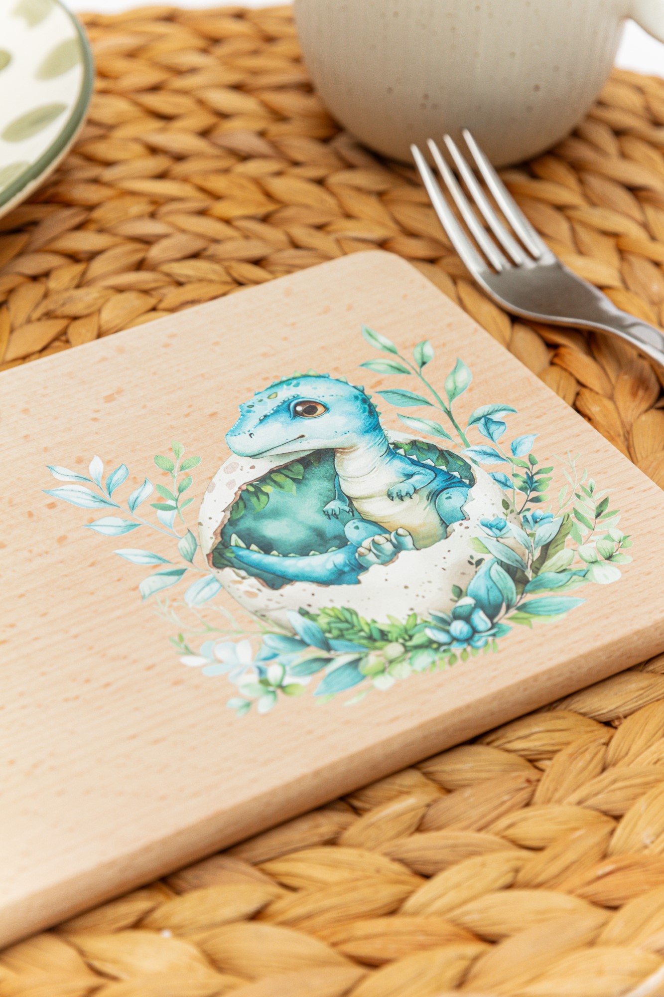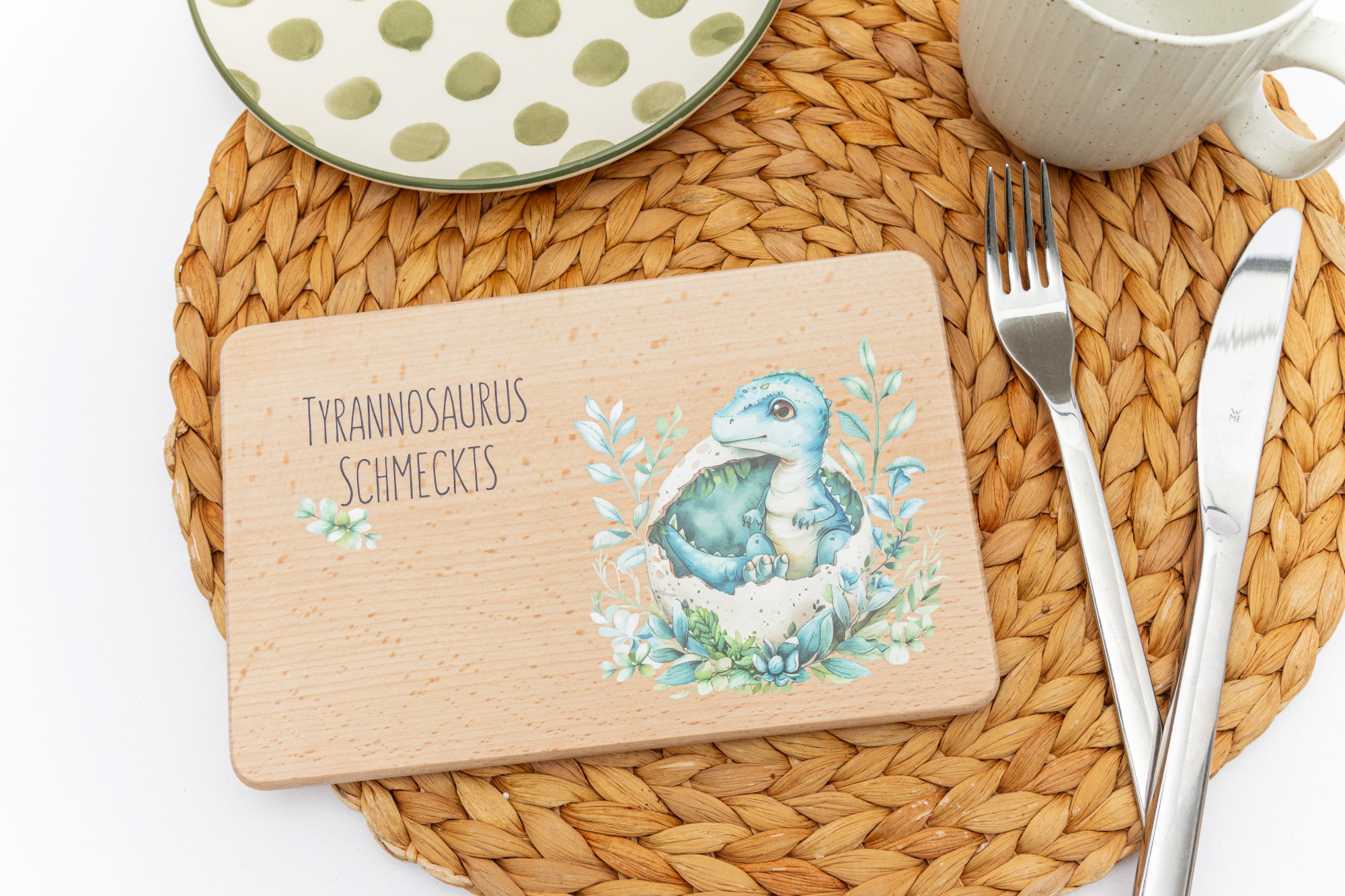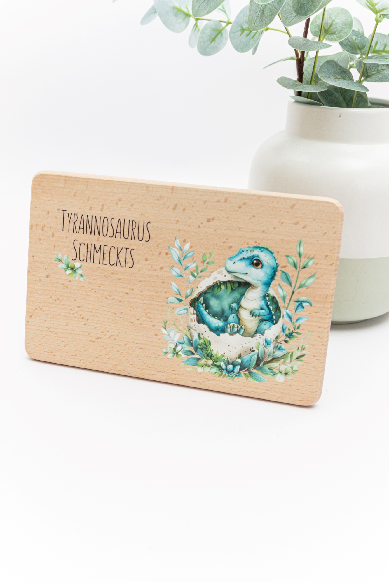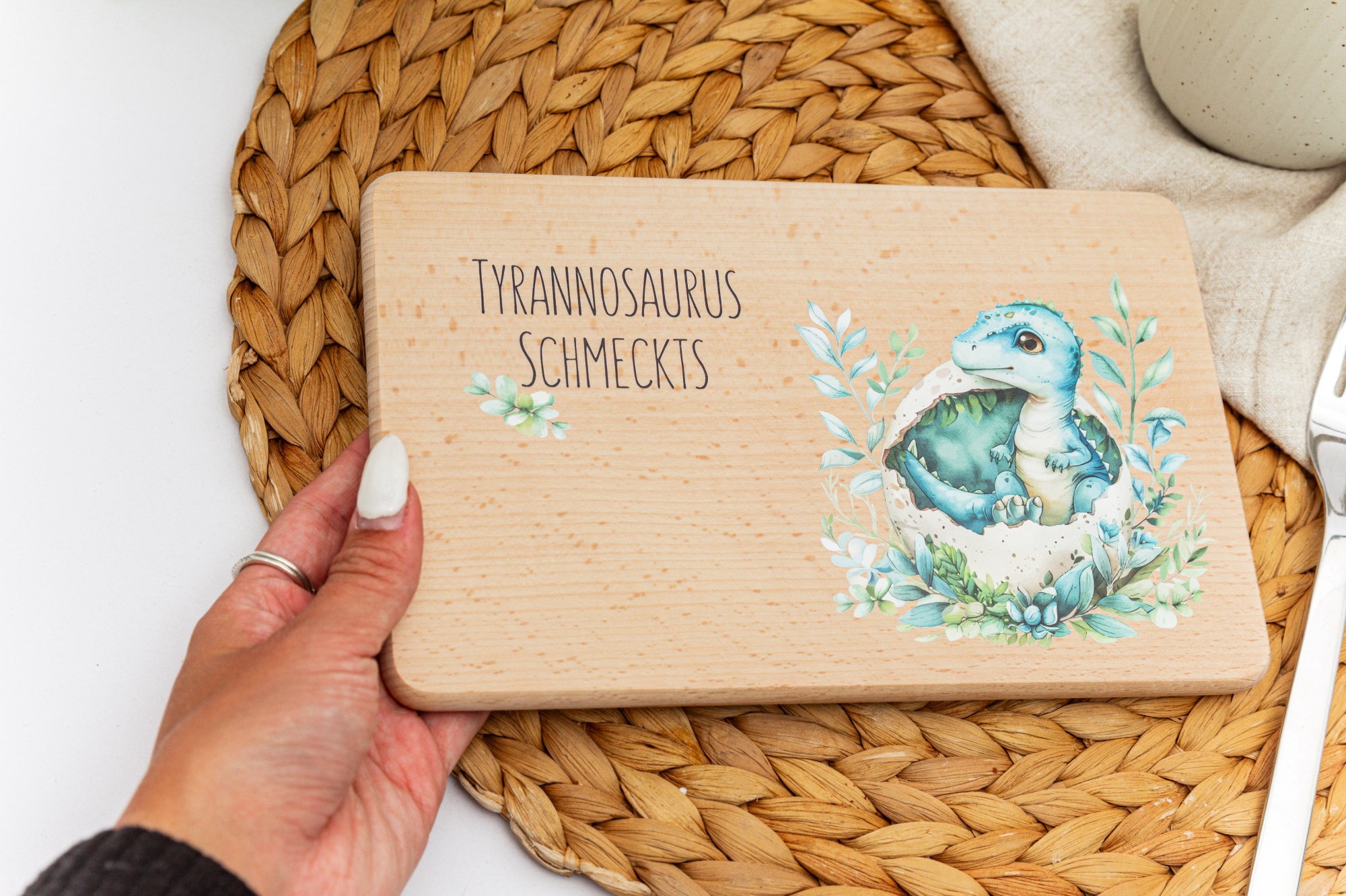 Holz-Brettchen für Kinder / Brotzeitbrett Dino mit Name / Schneidebrettchen personalisiert / Dino Brett mit Name / Tyrannosaurus Schmeckts